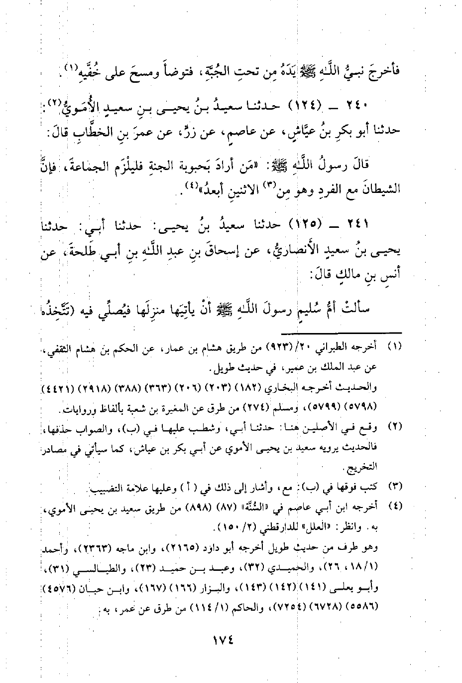 240 - (124) حدثنا سعيد بن يحيى بن سعيد الأموي: حدثنا أبو بكر بن عياش، عن عاصم، عن زر، عن عمر بن الخطاب قَالَ: قال رسول الله صلى الله عليه وسلم: من أراد بحبوة الجنة فليلزم الجماعة، فإن الشيطان مع الفرد وهو من الاثنين أبعد.
