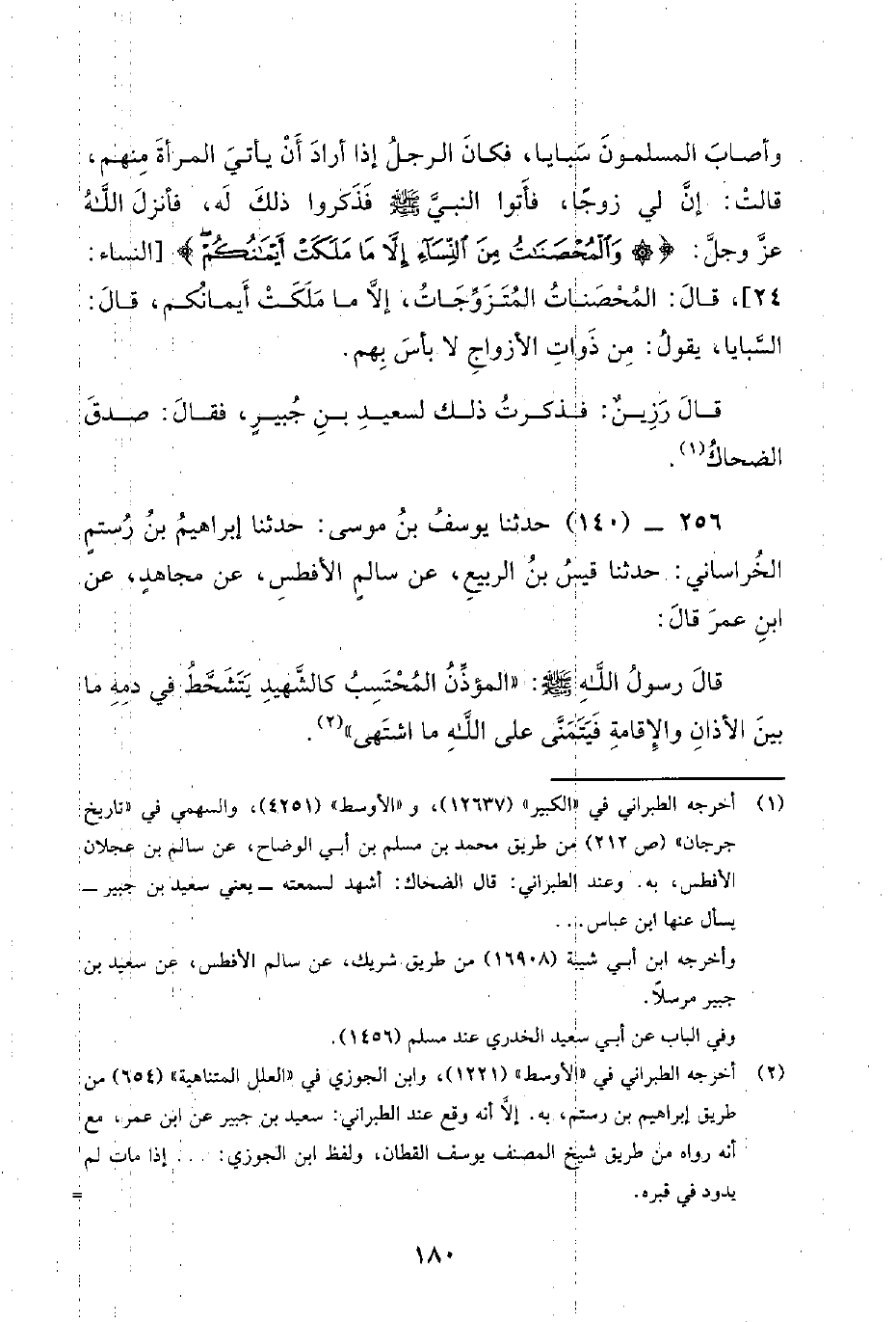 256 - (140) حدثنا يوسف بن موسى: حدثنا إبراهيم بن رستم الخراساني: حدثنا قيس بن الربيع، عن سالم الأفطس، عن مجاهد، عَنِ ابْنِ عُمَرَ قال: قال رسول الله صلى الله عليه وسلم: المؤذن المحتسب كالشهيد يتشحط في دمه ما بين الأذان والإقامة فيتمنى على الله ما اشتهى.