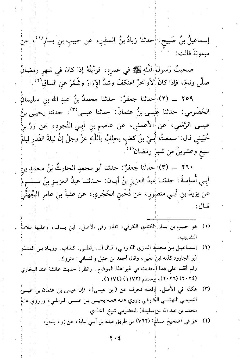 259 - (2) حَدَّثَنَا جَعْفَرٌ: حَدَّثَنَا مُحَمَّد بْن عَبْد اللَّه بْن سُلَيْمَانَ الْحَضْرَمِيُّ: حَدَّثَنَا عِيسَى بْنُ عُثْمَانَ: حَدَّثَنَا عِيسَى: حَدَّثَنَا يَحْيَى بْنُ عِيسَى الرَّمْلِيُّ، عَنِ الأَعْمَشِ، عَنْ عَاصِمِ بْنِ أَبِي النَّجُودِ، عَنْ زِرِّ بْنِ حُبَيْشٍ قَالَ: سَمِعْتُ أُبَيَّ بْنَ كَعْبٍ يَحْلِفُ بِاللَّهِ عَزَّ وَجَلَّ أَنَّ لَيْلَةَ الْقَدْرِ لَيْلَةُ سَبْعٍ وَعِشْرِينَ مِنْ شَهْرِ رمضان.