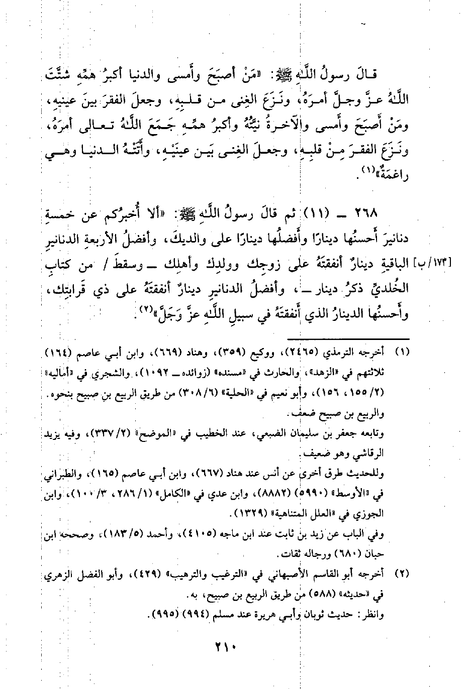 268 - (11) ثُمَّ قَالَ رَسُولُ اللَّهِ صَلَّى اللَّهُ عَلَيْهِ وَسَلَّمَ: أَلا أُخْبِرُكُمْ عَنْ خَمْسَةِ دَنَانِيرَ أَحْسَنُهَا دِينَارًا وَأَفْضَلُهَا دِينَارًا عَلَى وَالِدَيْكَ، وَأَفْضَلُ الأَرْبَعَةِ الدَّنَانِيرِ الْبَاقِيَةِ دِينَارٌ أَنْفَقْتَهُ عَلَى زَوْجِكَ وَوَلَدِكَ وَأَهْلِكَ - وَسَقَطَ / مِنْ كِتَابِ الْخَلَدِيِّ ذِكْرُ دِينَارٍ -، وأفضل الدنانير دينار أنفقته عَلَى ذِي قَرَابَتِكَ، وَأَحْسَنُهَا الدِّينَارُ الَّذِي أَنْفَقْتَهُ فِي سَبِيلِ اللَّهِ عز وجل.