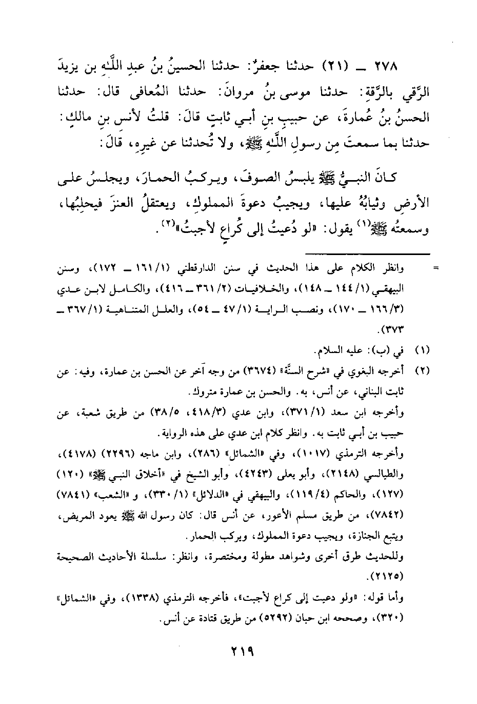 278 - (21) حَدَّثَنَا جَعْفَرٌ: حَدَّثَنَا الْحُسَيْنُ بْنُ عَبْدِ اللَّهِ بْنِ يَزِيدَ الرَّقِّيُّ بِالرَّقَّةِ: حَدَّثَنَا مُوسَى بْنُ مروان: حدثنا المعافى: حَدَّثَنَا الْحَسَنُ بْنُ عُمَارَةَ، عَنْ حَبِيبِ بْنِ أَبِي ثَابِتٍ قَالَ: قُلْتُ لأَنَسِ بْنِ مَالِكٍ: حَدِّثَنَا بِمَا سَمِعْتَ مِنْ رَسُول اللَّهِ صَلَّى اللَّهُ عَلَيْهِ وَسَلَّمَ، وَلا تُحَدِّثْنَا عَنْ غَيْرِهِ، قَالَ: كَانَ النَّبِيّ صَلَّى اللَّهُ عَلَيْهِ وَسَلَّمَ يَلْبَسُ الصُّوفَ، وَيَرْكَبُ الْحِمَارَ، وَيَجْلِسُ عَلَى الأَرْضِ وَثِيَابُهُ عَلَيْهَا، وَيُجِيبُ دَعْوَةَ الْمَمْلُوكِ، وَيَعْتَقِلُ الْعَنْزَ فَيَحْلِبُهَا، وَسَمِعْتُهُ صَلَّى اللَّهُ عَلَيْهِ وَسَلَّمَ يَقُولُ: لَوْ دُعِيتُ إِلَى كراع لأجبت.