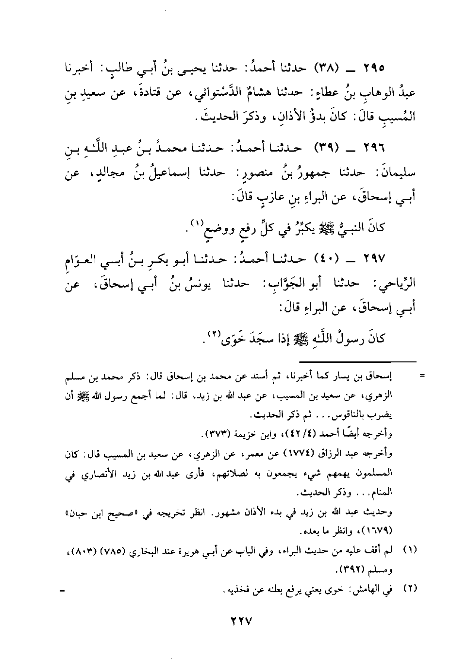 297 - (40) حَدَّثَنَا أَحْمَدُ: حَدَّثَنَا أَبُو بَكْرِ بْنُ أَبِي الْعَوَّامِ الرِّيَاحِيُّ: حَدَّثَنَا أَبُو الْجَوَابِ: حَدَّثَنَا يُونُسُ بْنُ أَبِي إِسْحَاقَ، عَنْ أَبِي إِسْحَاقَ، عَنْ الْبَرَاءِ قَالَ: كَانَ رَسُولُ اللَّهِ صَلَّى اللَّهُ عَلَيْهِ وَسَلَّمَ إِذَا سجد خوى.