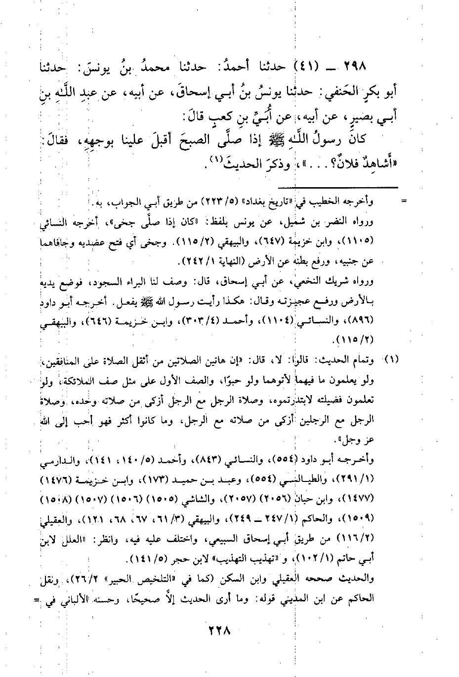 298 - (41) حَدَّثَنَا أَحْمَدُ: حَدَّثَنَا مُحَمَّدُ بْنُ يُونُسَ: حَدَّثَنَا أَبُو بَكْرٍ الْحَنَفِيُّ: حَدَّثَنَا يُونُسُ بْنُ أَبِي إِسْحَاقَ، عَنْ أَبِيهِ، عَنْ عَبْدِ اللَّهِ بْنِ أَبِي بَصِيرٍ، عَنْ أَبِيهِ، عَنْ أُبَيِّ بْنِ كَعْبٍ قَالَ: كَانَ رَسُولُ اللَّهِ صَلَّى اللَّهُ عَلَيْهِ وَسَلَّمَ إِذَا صَلَّى الصُّبْحَ أَقْبَلَ عَلَيْنَا بِوَجْهِهِ، فَقَالَ: أَشَاهِدٌ فُلانٌ؟ .. ، وَذَكَرَ الْحَدِيثَ.