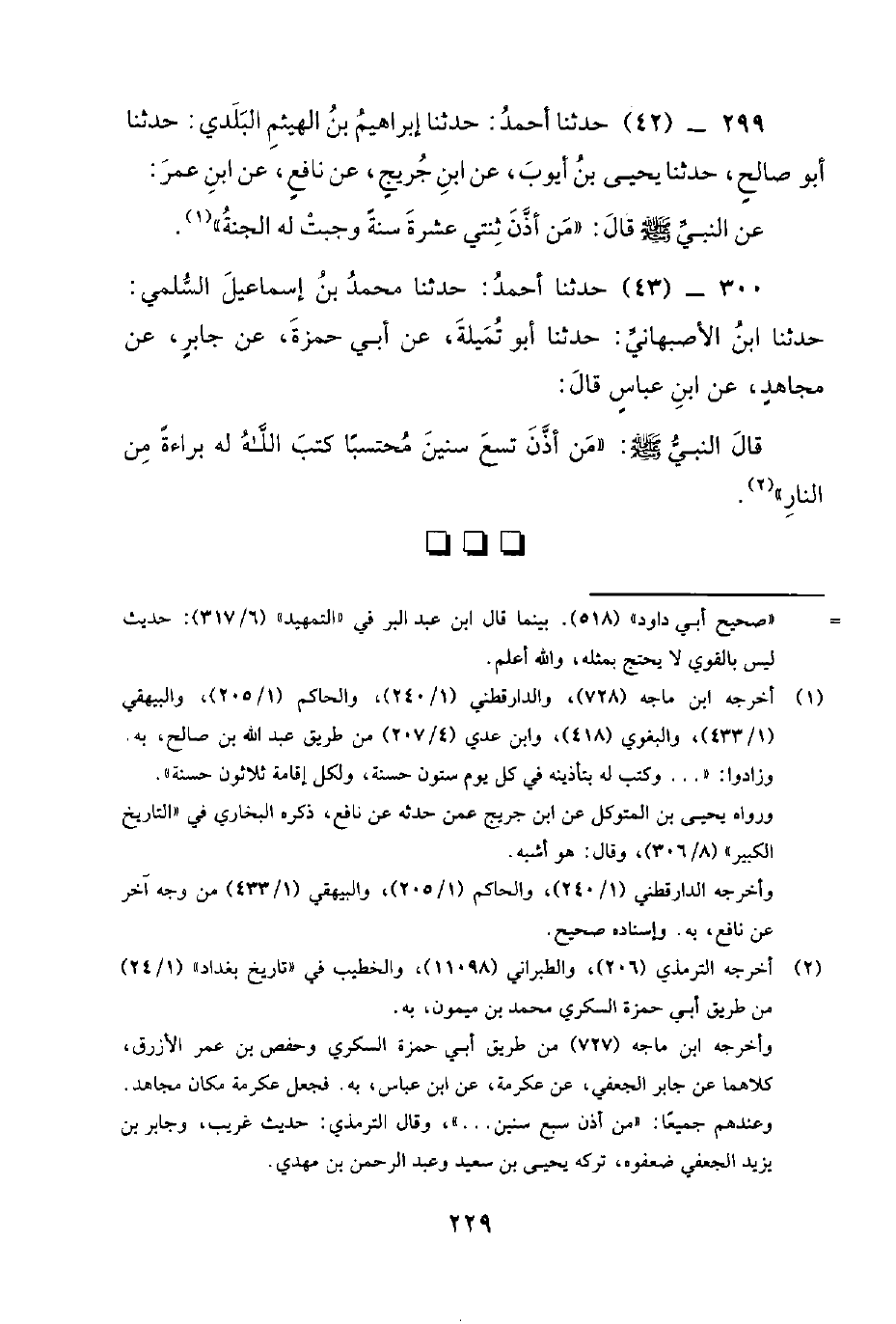 299 - (42) حَدَّثَنَا أَحْمَدُ: حَدَّثَنَا إِبْرَاهِيمُ بْنُ الْهَيْثَمِ الْبَلَدِيُّ: حَدَّثَنَا أَبُو صَالِحٍ، حَدَّثَنَا يَحْيَى بْنُ أَيُّوبَ، عن ابن جُرَيْجٍ، عَنْ نَافِعٍ، عَنْ ابْنِ عُمَرَ: عَنِ النبي صلى الله عليه وسلم قال: من أَذَّنَ ثِنْتَيْ عَشَرَةَ سَنَةً وَجَبَتْ لَهُ الْجَنَّةُ.