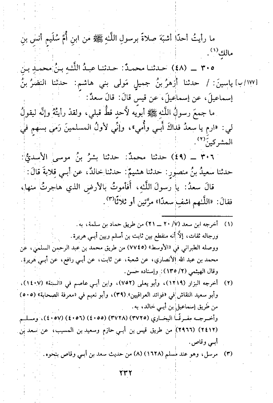 305 - (48) حَدَّثَنَا مُحَمَّدٌ: حَدَّثَنَا عَبْدُ اللَّهِ بْنُ مُحَمَّدِ بْنِ يَاسِينَ: / حَدَّثَنَا أَزْهَرُ بْنُ جَمِيلٍ مَوْلَى بَنِي هَاشِمٍ: حَدَّثَنَا النَّضْرُ بْنُ إِسْمَاعِيلَ، عَنْ إِسْمَاعِيلَ، عَنْ قَيْسٍ قَالَ: قَالَ سَعْدٌ. مَا جَمَعَ رَسُول اللَّهِ صَلَّى اللَّهُ عَلَيْهِ وَسَلَّمَ أَبَوَيْهِ لأَحَدٍ قَطُّ قَبْلِي، وَلَقَدْ رَأَيْتُهُ وَإِنَّهُ لَيَقُولُ لِي: ارْمِ يَا سَعْدُ فِدَاكَ أَبِي وَأُمِّي، وَإِنِّي لأَوَّلُ الْمُسْلِمِينَ رَمَى بِسَهْمٍ فِي المشركين.