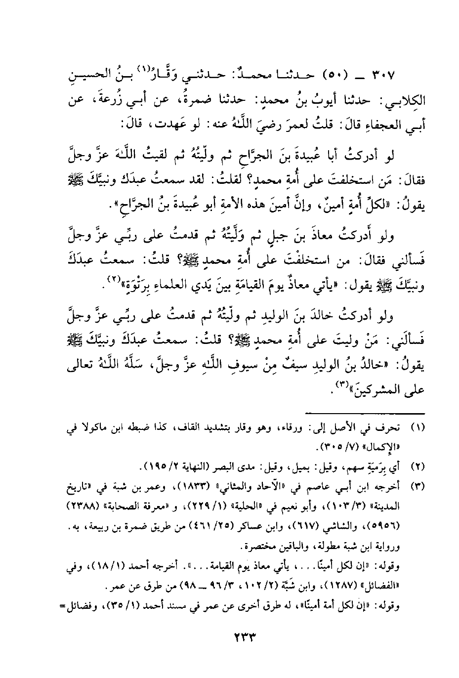 307 - (50) حَدَّثَنَا مُحَمَّدٌ: حَدَّثَنِي وَقَارُ بْنُ الْحُسَيْنِ الْكِلابِيُّ: حَدَّثَنَا أَيُّوبُ بْنُ مُحَمَّدٍ: حَدَّثَنَا ضَمْرَةُ، عَنْ أَبِي زُرْعَةَ، عَنْ أَبِي الْعَجْفَاءِ قَالَ: قُلْتُ لِعُمَرَ رَضِيَ اللَّهُ عَنْهُ: لَوْ عَهِدْتَ، قَالَ: لَوْ أَدْرَكْتُ أَبَا عُبَيْدَةَ بْنَ الْجَرَّاحِ ثُمَّ وَلَّيْتُهُ ثُمَّ لَقِيتُ اللَّهَ عَزَّ وَجَلَّ فَقَالَ: من استخلفت على أمة محمد؟ لقلت: سَمِعْتُ عَبْدَكَ وَنَبِيَّكَ صَلَّى اللَّهُ عَلَيْهِ وَسَلَّمَ يَقُولُ: لِكُلِّ أُمَّةٍ أَمِينٌ، وَإِنَّ أَمِينَ هَذِهِ الأُمَّةِ أَبُو عُبَيْدَةَ بْنُ الْجَرَّاحِ.