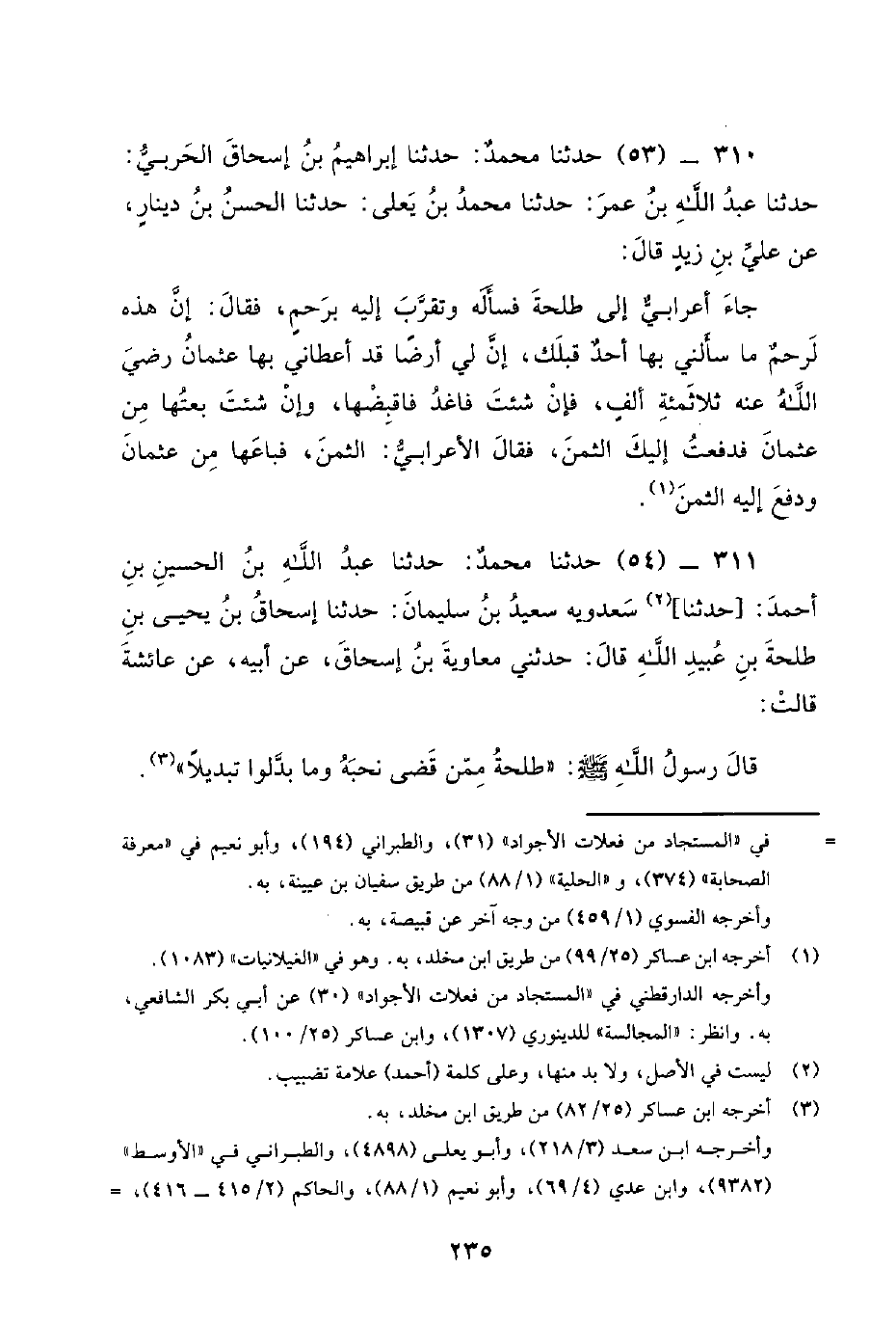 310 - (53) حَدَّثَنَا مُحَمَّدٌ: حَدَّثَنَا إِبْرَاهِيمُ بْنُ إِسْحَاقَ الْحَرْبِيُّ: حَدَّثَنَا عَبْدُ اللَّهِ بْنُ عُمَرَ: حَدَّثَنَا مُحَمَّدُ بْنُ يَعْلَى: حَدَّثَنَا الْحَسَنُ بْنُ دِينَارٍ، عَنْ عَلِيِّ بْنِ زَيْدٍ قَالَ: جَاءَ أَعْرَابِيٌّ إِلَى طَلْحَةَ فَسَأَلَهُ وَتَقَرَّبَ إِلَيْهِ بِرَحِمٍ، فَقَالَ: إِنَّ هَذِهِ لَرَحِمٌ مَا سَأَلَنِي بِهَا أَحَدٌ قَبْلَكَ، إِنَّ لِي أَرْضًا قَدْ أَعْطَانِي بِهَا عُثْمَانُ رضي الله عنه ثلاثمئة أَلْفٍ، فَإِنْ شِئْتَ فَاغْدُ فَاقْبِضْهَا، وَإِنْ شِئْتَ بِعْتَهَا مِنْ عُثْمَانَ فَدَفَعْتُ إِلَيْكَ الثَّمَنَ، فَقَالَ الأَعْرَاِبُّي: الثَّمَنُ، فَبَاعَهَا مِنْ عُثْمَانَ وَدَفَعَ إِلَيْهِ الثَّمَنَ.