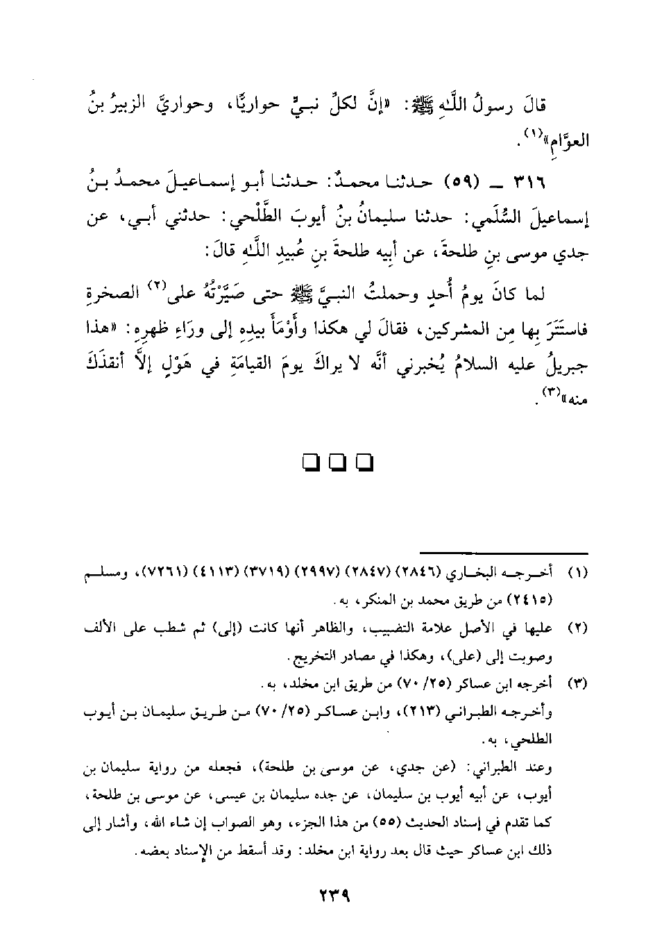 316 - (59) حَدَّثَنَا مُحَمَّدٌ: حَدَّثَنَا أَبُو إِسْمَاعِيلَ مُحَمَّدُ بْنُ إسماعيل السلمي: حدثنا سليمان بن أيوب الطلحي: حدثني أبي، عن جدي مُوسَى بْنِ طَلْحَةَ، عَنْ أَبِيهِ طَلْحَةَ بْنِ عُبَيْدِ اللَّهِ قَالَ: لَمَّا كَانَ يَوْمُ أُحُدٍ وَحَمَلْتُ النَّبِيّ صَلَّى اللَّهُ عَلَيْهِ وَسَلَّمَ حَتَّى صَيَّرْتُهُ عَلَى الصَّخْرَةِ فَاسْتَتَرَ بِهَا مِنَ الْمُشْرِكِينَ، فَقَالَ لِي هَكَذَا وَأَوْمَأَ بِيَدِهِ إِلَى وَرَاءِ ظَهْرِهِ: هَذَا جِبْرِيلُ عَلَيْهِ السَّلامُ يُخْبِرُنِي أَنَّهُ لا يَرَاكَ يَوْمَ الْقِيَامَةِ فِي هَوْلٍ إِلا أنقذك منه.