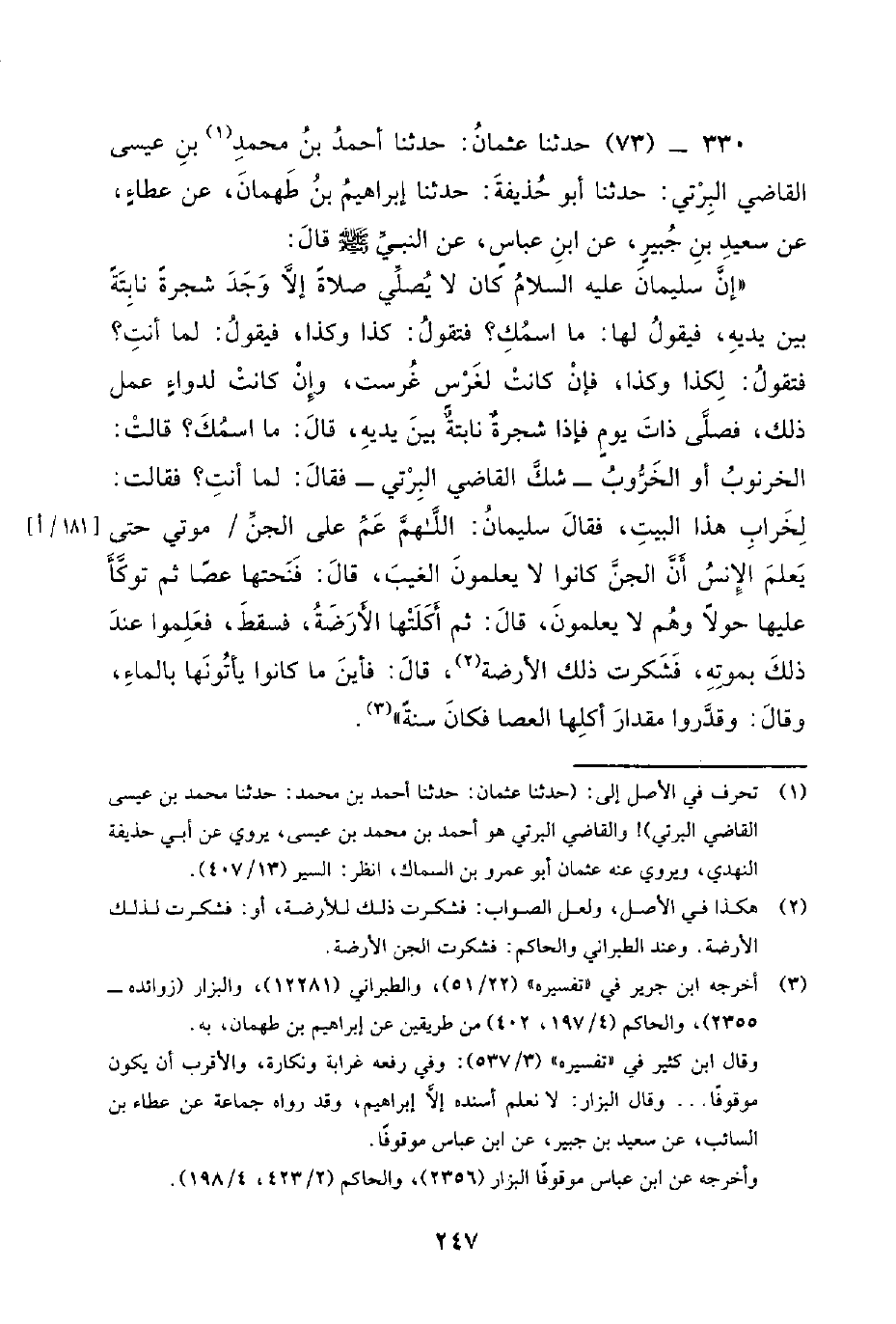 330 - (73) حَدَّثَنَا عُثْمَانُ: حَدَّثَنَا أَحْمَدُ بْنُ مُحَمَّدِ بْنِ عِيسَى الْقَاضِي الْبِرْتِيُّ: حَدَّثَنَا أَبُو حُذَيْفَةَ: حَدَّثَنَا إِبْرَاهِيمُ بْنُ طُهْمَانَ، عَنْ عَطَاءٍ، عَنْ سَعِيدِ بْنِ جُبَيْرٍ، عَنْ ابْنِ عَبَّاسٍ، عَنِ النَّبِيِّ صَلَّى اللَّهُ عَلَيْهِ وَسَلَّمَ قَالَ: إِنَّ سُلَيْمَانَ عَلَيْهِ السَّلامُ كَانَ لا يُصَلِّي صَلاةً إِلا وَجَدَ شَجَرَةً نَابِتَةً بَيْنَ يَدَيْهِ، فَيَقُولُ لَهَا: مَا اسْمُكِ؟ فَتَقُولُ: كَذَا وَكَذَا، فَيَقُولُ: لِمَا أَنْتِ؟ فَتَقُولُ: لِكَذَا وَكَذَا، فَإِنْ كَانَتْ لِغَرْسٍ غُرِسَتْ، وَإِنْ كَانَتْ لِدَوَاءٍ عُمِلَ ذَلِكَ، فَصَلَّى ذَاتَ يَوْمٍ فَإِذَا شَجَرَةٌ نَابِتَةٌ بَيْنَ يَدَيْهِ، قَالَ: مَا اسْمُكِ؟ قَالَتْ: الخَرْنُوبُ أَوِ الْخَرُّوبُ - شَكَّ الْقَاضِي الْبِرْتِيُّ - فَقَالَ: لِمَا أَنْتِ؟ فَقَالَتْ: لِخَرَابِ هَذَا الْبَيْتِ، فَقَالَ سُلَيْمَانُ: اللَّهُمَّ عَمِّ عَلَى الْجِنِّ / مَوْتِي حَتَّى يَعْلَمَ الإِنْسُ أَنَّ الْجِنَّ كَانُوا لا يَعْلَمُونَ الْغَيْبَ، قَالَ: فَنَحَتَهَا عَصًا ثُمَّ تَوَكَّأَ عَلَيْهَا حَوْلًا وَهُمْ لا يَعْلَمُونَ، قَالَ: ثُمَّ أَكَلَتْهَا الأَرَضَةُ، فَسَقَطَ، فَعَلِمُوا عِنْدَ ذَلِكَ بِمَوْتِهِ، فَشَكَرَتْ ذَلِكَ الأَرَضَةُ، قَالَ: فَأَيْنَ مَا كَانُوا يَأْتُونَهَا بِالْمَاءِ، وَقَالَ: وَقَدَّرُوا مِقْدَارَ أَكْلِهَا الْعَصَا فَكَانَ سَنَةً.