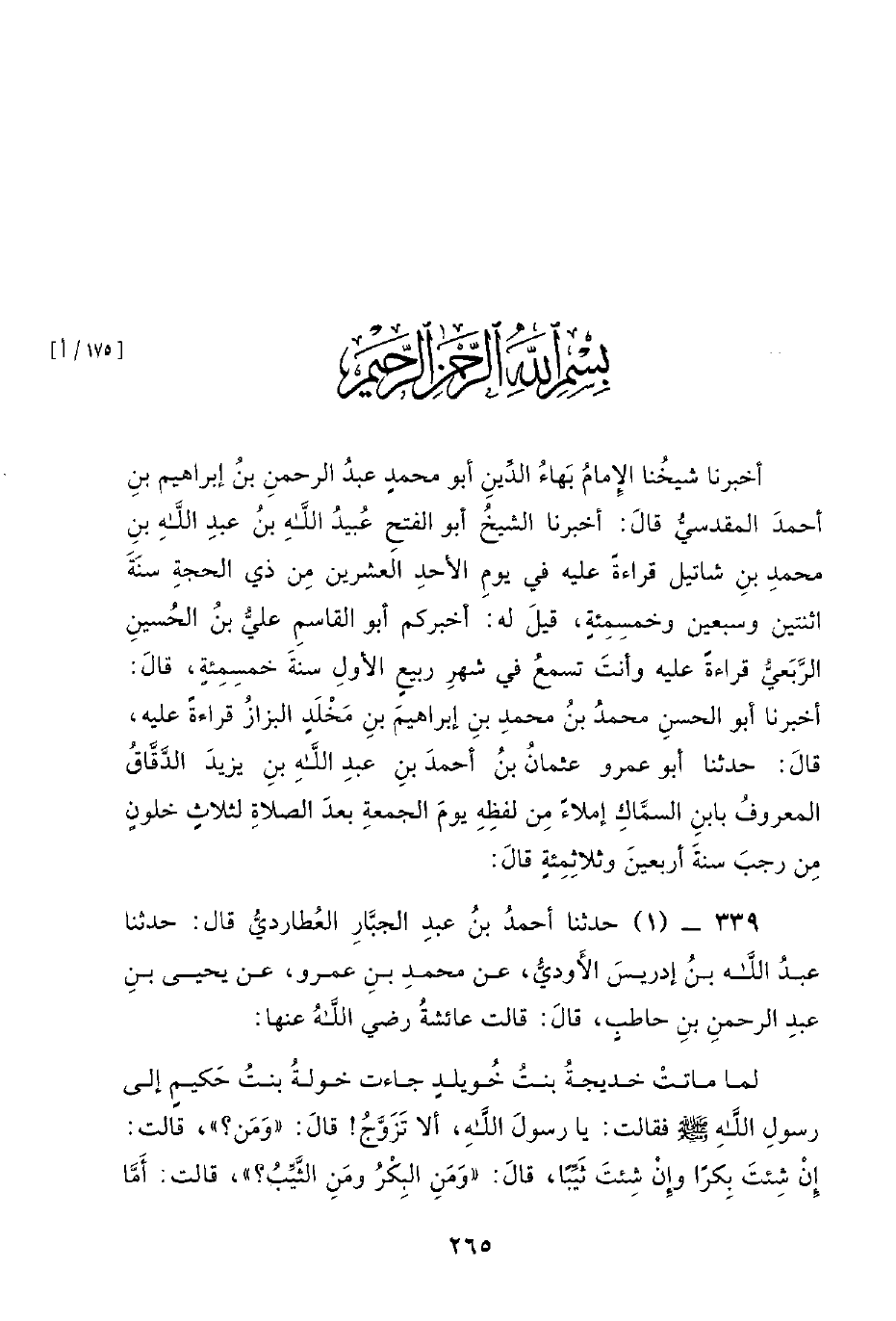 339 - (1) حدثنا أحمد بن عَبْدِ الْجَبَّارِ الْعُطَارِدِيُّ قَالَ: حَدَّثَنَا عَبْدُ اللَّهِ بْنُ إِدْرِيسَ الأَوْدِيُّ، عَنْ مُحَمَّدِ بْنِ عَمْرٍو، عَنْ يَحْيَى بْنِ عَبْدِ الرَّحْمَنِ بْنِ حَاطِبٍ، قَالَ: قَالَتْ عَائِشَةُ رَضِيَ اللَّهُ عَنْهَا: لَمَّا مَاتَتْ خَدِيجَةُ بِنْتُ خُوَيْلِدٍ جَاءَتْ خَوْلَةُ بِنْتُ حَكِيمٍ إِلَى رَسُولِ اللَّهِ صَلَّى اللَّهُ عَلَيْهِ وَسَلَّمَ فَقَالَتْ: يَا رَسُولَ اللَّهِ، أَلا تَزَوَّجُ! قَالَ: وَمَنْ؟ قَالَتْ: إِنْ شِئْتَ بِكْرًا وَإِنْ شِئْتَ ثَيِّبًا، قَالَ: وَمَنِ الْبِكْرُ وَمَنِ الثَّيِّبُ؟ قَالَتْ: أَمَّا -[266]- الْبِكْرُ فَابْنَةُ أَحَبِّ خَلْقِ اللَّهِ تَعَالَى إِلَيْكَ عَائِشَةُ بِنْتُ أَبِي بَكْرٍ الصِّدِّيقِ، وَأَمَّا الثَّيِّبُ فَسَوْدَةُ بِنْتُ زَمْعَةَ، آمَنَتْ بِكَ وَاتَّبَعَتْكَ، قَالَ: فَاذْكُرِيهِمَا عَلَيٍّ. قَالَتْ: فَأَتَيْتُ أُمَّ رُومَانَ فَقُلْتُ: يَا أُمَّ رُومَانَ، وَمَاذَا أَدْخَلَ اللَّهُ عَلَيْكُمْ مِنَ الْخَيْرِ وَالْبَرَكَةِ، قَالَتْ: وَذَاكَ مَاذَا؟ قَالَتْ: رَسُول اللَّهِ صَلَّى اللَّهُ عَلَيْهِ وَسَلَّمَ يَذْكُرُ عَائِشَةَ، قَالَتْ: انْتَظِرِي فَإِنَّ أَبَا بَكْرٍ آتٍ، قَالَتْ: فَجَاءَ أَبُو بَكْرٍ رَضِيَ اللَّهُ عَنْهُ، فَذَكَرَتْ / ذَلِكَ لَهُ، فَقَالَ: أَوَ تَصْلُحُ لَهُ وَهِيَ ابْنَةُ أَخِيهِ؟ فَقَالَ رَسُولُ اللَّهِ صَلَّى اللَّهُ عَلَيْهِ وَسَلَّمَ: أَنَا أَخُوهُ وَهُوَ أَخِي، وَابْنَتُهُ تَصْلُحُ لِي، قَالَتْ: وَقَامَ أَبُو بَكْرٍ، فَقَالَتْ لِي أُمُّ رُومَانَ: إِنَّ الْمُطْعِمَ بْنَ عَدِيٍّ قَدْ كَانَ ذَكَرَهَا عَلَى ابْنِهِ، فَوَاللَّهِ مَا أَخْلَفَ وَعْدًا قَطُّ - تَعْنِي أَبَا بَكْرٍ -.