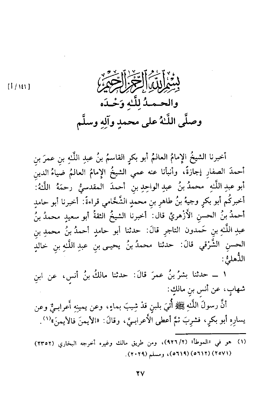 1 - حَدَّثَنَا بِشْرُ بْنُ عُمَرَ قَالَ: حَدَّثَنَا مَالِكُ بْنُ أَنَسٍ، عَنْ ابْنِ شِهَابٍ، عَنْ أَنَسِ بْنِ مَالِكٍ: أَنَّ رَسُول اللَّهِ صَلَّى اللَّهُ عَلَيْهِ وَسَلَّمَ أُتِيَ بِلَبَنٍ قَدْ شِيبَ بِمَاءٍ، وَعَنْ يَمِينِهِ أَعْرَابِيٍّ وَعَنْ يَسَارِهِ أَبُو بَكْرٍ، فَشَرِبَ ثُمَّ أَعْطَى الأَعْرَابِيَّ، وَقَالَ: الأيمن فالأيمن.