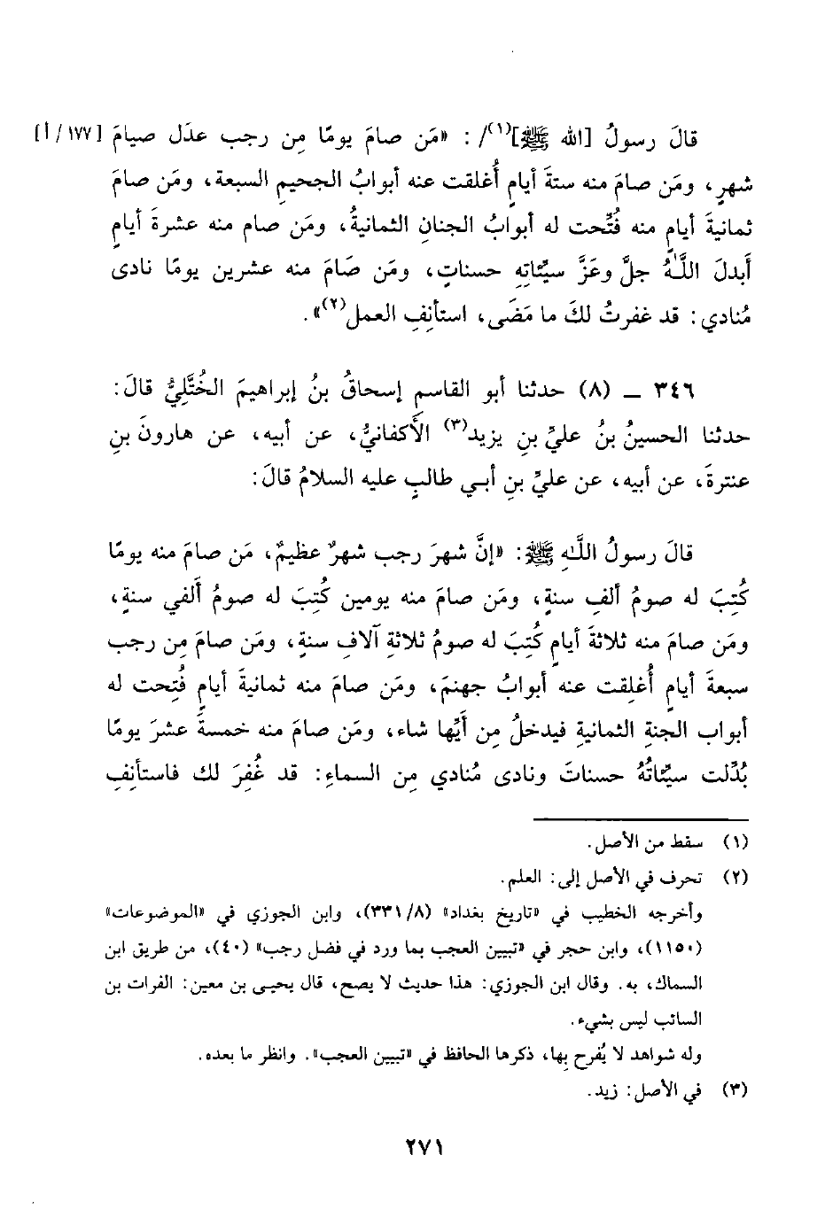 346 - (8) حَدَّثَنَا أَبُو الْقَاسِمِ إِسْحَاقُ بْنُ إِبْرَاهِيمَ الْخُتُلِّيُّ قَالَ: حَدَّثَنَا الْحُسَيْنُ بْنُ عَلِيِّ بْنِ يَزِيدَ الأَكْفَانِيُّ، عَنْ أَبِيهِ، عَنْ هَارُونَ بْنِ عَنْتَرَةَ، عَنْ أَبِيهِ، عَنْ عَلِيِّ بْنِ أَبِي طَالِبٍ عَلَيْهِ السَّلامُ قَالَ: قَالَ رَسُولُ اللَّهِ صَلَّى اللَّهُ عَلَيْهِ وَسَلَّمَ: إِنَّ شَهْرَ رَجَبٍ شَهْرٌ عَظِيمٌ، مَنْ صَامَ مِنْهُ يَوْمًا كُتِبَ لَهُ صَوْمُ أَلْفِ سَنَةٍ، وَمَنْ صَامَ مِنْهُ يَوْمَيْنِ كُتِبَ لَهُ صَوْمُ أَلْفَيْ سَنَةٍ، وَمَنْ صَامَ مِنْهُ ثَلاثَةَ أَيَّامٍ كُتِبَ لَهُ صَوْمُ ثَلاثَةُ آلافِ سَنَةٍ، وَمَنْ صَامَ مِنْ رَجَبٍ سَبْعَةَ أَيَّامٍ أُغْلِقَتْ عَنْهُ أَبْوَابَ جَهَنَّمَ، وَمَنْ صَامَ مِنْهُ ثَمَانِيَةَ أَيَّامٍ فُتِحَتْ لَهُ أَبْوَابُ الْجَنَّةِ الثَّمَانِيَةُ فَيَدْخُلُ مِنْ أَيِّهَا شَاءَ، وَمَنْ صَامَ منه خمسة عشرة يَوْمًا بُدِّلَتْ سَيِّئَاتُهُ حَسَنَاتٍ وَنَادَي مُنَادِي مِنَ السَّمَاءِ: قَدْ غُفِرَ لَكَ فَاسْتَأْنِفِ -[272]- الْعَمَلَ، وَمَنْ زَادَ زَادَهُ اللَّهُ عَزَّ وجل.