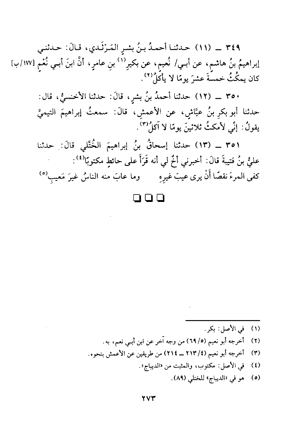349 - (11) حدثنا أحمد بن بشر المرثدي، قال: حدثني إبراهيم بن هاشم، عن أبي / نعيم، عن بكير بن عامر، أنّ ابن أبي نعم كان يمكث خمسة عشر يوما لا يأكل.