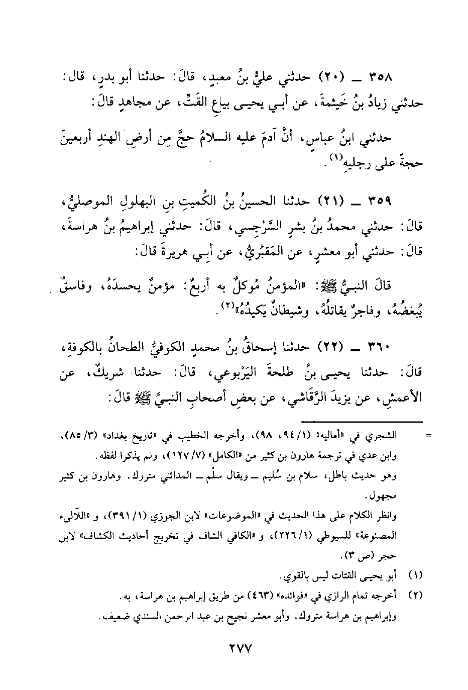 358 - (20) حَدَّثَنِي عَلِيُّ بْنُ مَعْبَدٍ، قَالَ: حَدَّثَنَا أَبُو بدر، قال: حدثني زياد بن خيثمة، عَنْ أَبِي يَحْيَى بَيَّاعِ الْقَتِّ، عَنْ مُجَاهِدٍ قَالَ: حَدَّثَنِي ابْنُ عَبَّاسٍ، أَنَّ آدَمَ عَلَيْهِ السَّلامُ حَجَّ مِنْ أَرْضِ الْهِنْدِ أَرْبَعِينَ حَجَّةً على رجليه.