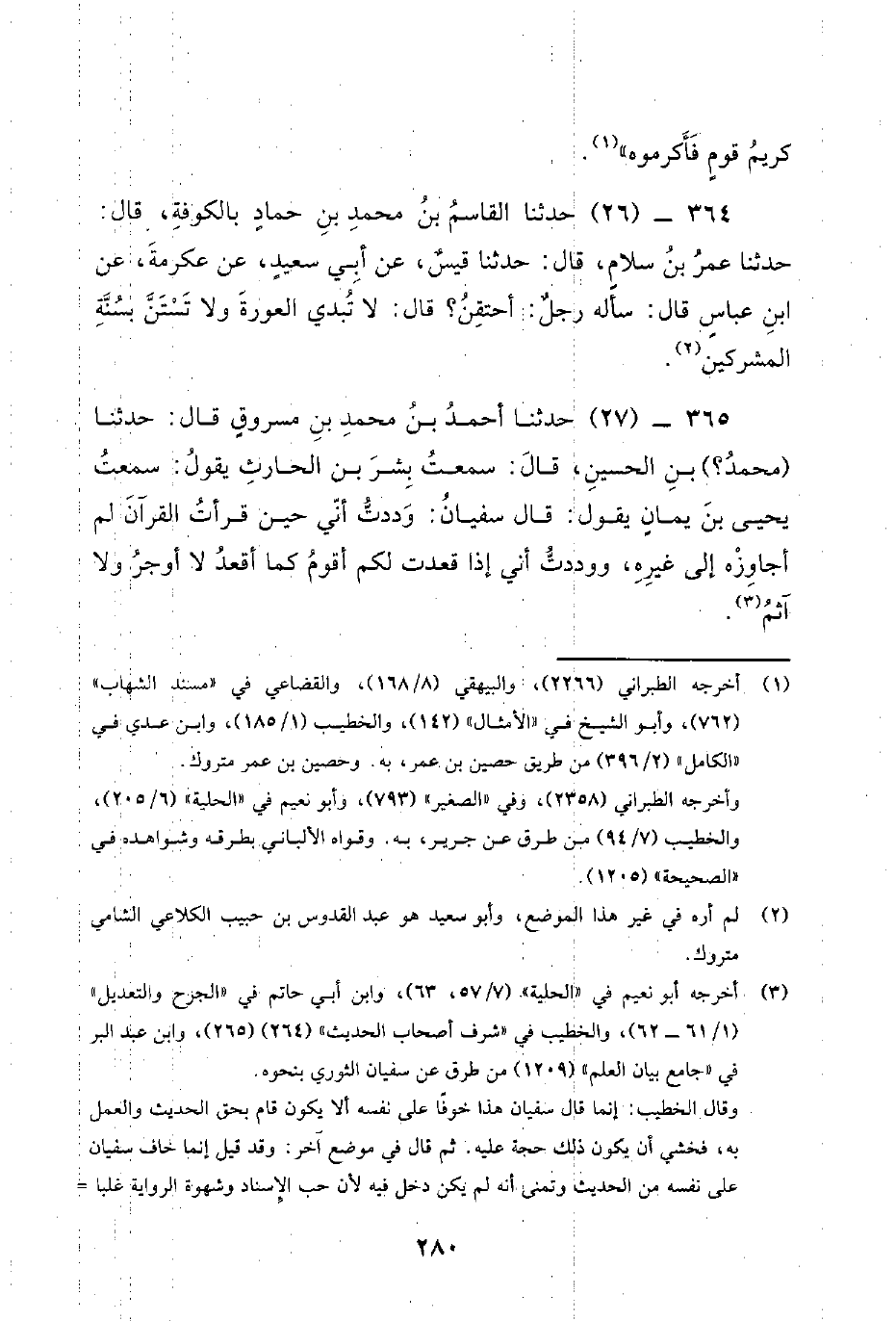 365 - (27) حدثنا أحمد بن محمد بن مسروق قال: حدثنا محمد بن الحسين، قال: سمعت بشر بن الحارث يقول: سمعت يحيى بن يمان يقول: قال سفيان: وددت أني حين قرأت القرآن لم أجاوزه إلى غيره، ووددت أني إذا قعدت لكم أقوم كما أقعد لا أوجر ولا آثم.