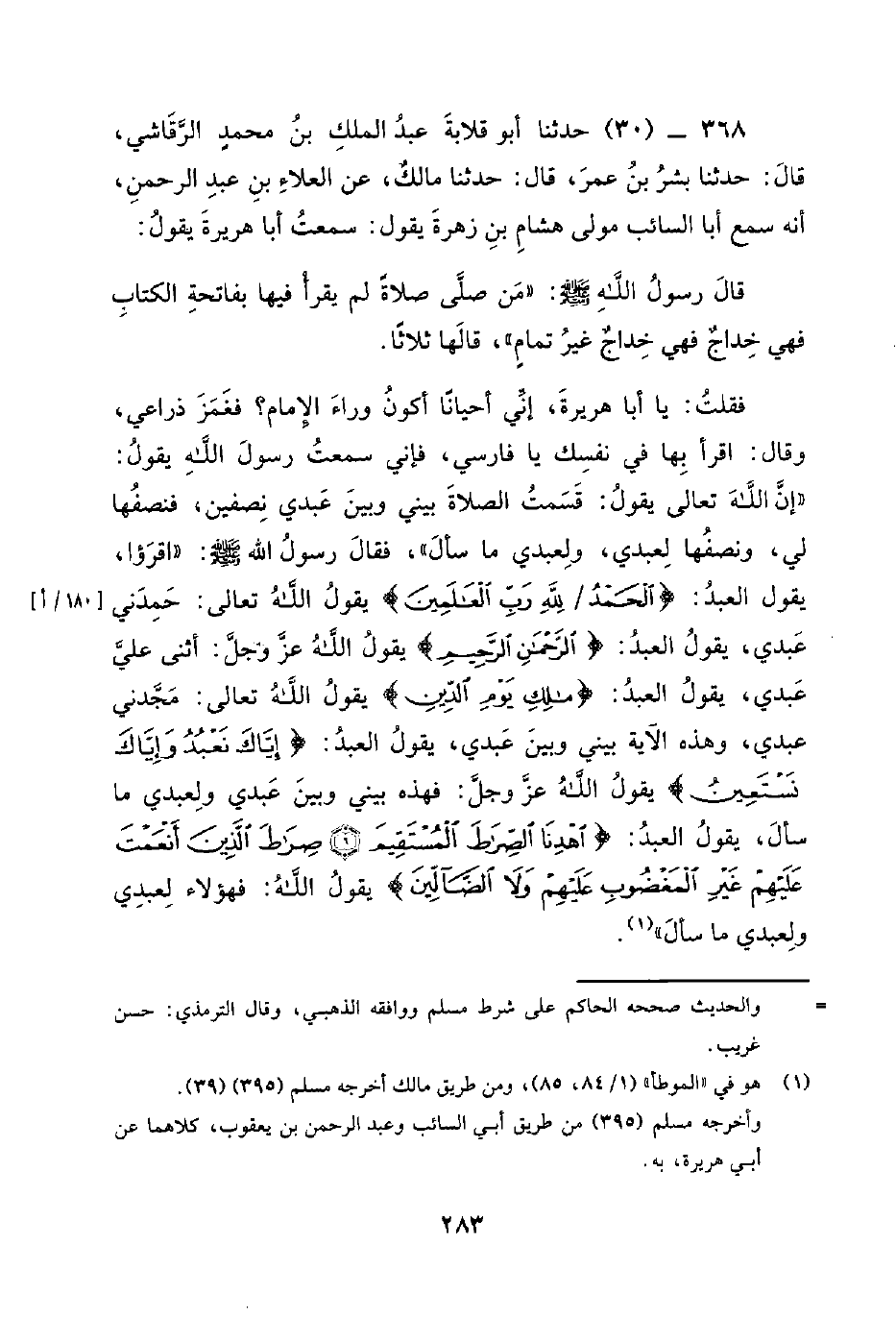 368 - (30) حَدَّثَنَا أَبُو قِلابَةَ عَبْدُ الْمَلِكِ بْنُ مُحَمَّدٍ الرَّقَاشِيُّ، قَالَ: حَدَّثَنَا بِشْرُ بْنُ عُمَرَ، قَالَ: حَدَّثَنَا مَالِكٌ، عَنِ الْعَلاءِ بْنِ عَبْدِ الرَّحْمَنِ، أَنَّهُ سَمِعَ أَبَا السَّائِبِ مَوْلَى هِشَامِ بْنِ زُهْرَةَ يَقُولُ: سَمِعْتُ أَبَا هُرَيْرَةَ يَقُولُ: قَالَ رسول الله صلى الله عليه وسلم: من صَلَّى صَلاةً لَمْ يَقْرَأْ فِيهَا بِفَاتِحَةِ الْكِتَابِ فَهِيَ خِدَاجٌ فَهِيَ خِدَاجٌ غَيْرُ تَمَامٍ، قَالَهَا ثَلاثًا.