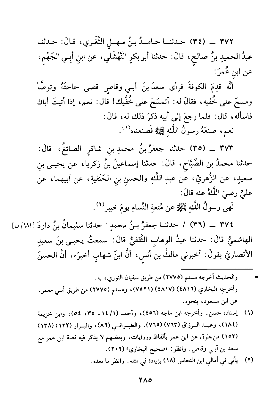 372 - (34) حَدَّثَنَا حَامِدُ بْنُ سَهْلٍ الثَّغْرِيُّ، قَالَ: حَدَّثَنَا عَبْدُ الْحَمِيدِ بْنِ صَالِحٍ، قَالَ: حَدَّثَنَا أَبُو بَكْرٍ النَّهْشَلِيُّ، عَنِ ابْنِ أَبِي الْجَهْمِ، عَنِ ابْنِ عُمَرَ: أَنَّهُ قَدِمَ الْكُوفَةَ فَرَأَى سَعْدَ بْنَ أَبِي وَقَّاصٍ قَضَى حَاجَتَهُ وَتَوَضَّأَ وَمَسَحَ عَلَى خُفَّيْهِ، فَقَالَ لَهُ: أَتَمْسَحُ عَلَى خُفَّيْكَ! قَالَ: نَعَمْ، إِذَا أَتَيْتَ أَبَاكَ فَاسْأَلْهُ، قَالَ: فَلَمَّا رَجَعَ إِلَى أَبِيهِ ذَكَرَ ذَلِكَ لَهُ، قَالَ: نَعَمْ، صَنَعَهُ رَسُول اللَّهِ صَلَّى اللَّهُ عَلَيْهِ وَسَلَّمَ فَصَنَعْنَاهُ.