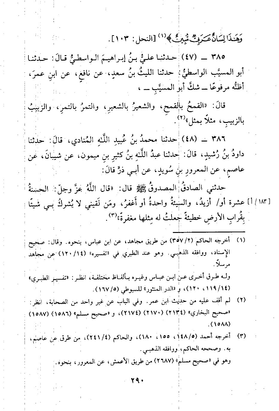 385 - (47) حَدَّثَنَا عَلِيُّ بْنُ إِبْرَاهِيمَ الْوَاسِطِيُّ قَالَ: حَدَّثَنَا أَبُو الْمُسَيِّبِ الْوَاسِطِيُّ: حَدَّثَنَا اللَّيْثُ بْنُ سَعْدٍ، عَنْ نَافِعٍ، عَنِ ابْنِ عُمَرَ، أَظُنُّهُ مَرْفُوعًا - شَكَّ أَبُو المسيب -، قال: القمح بالقمح، والشعير بالشعير، والتمر بِالتَّمْرِ، وَالزَّبِيبُ بِالزَّبِيبِ، مِثْلا بِمِثْلٍ.