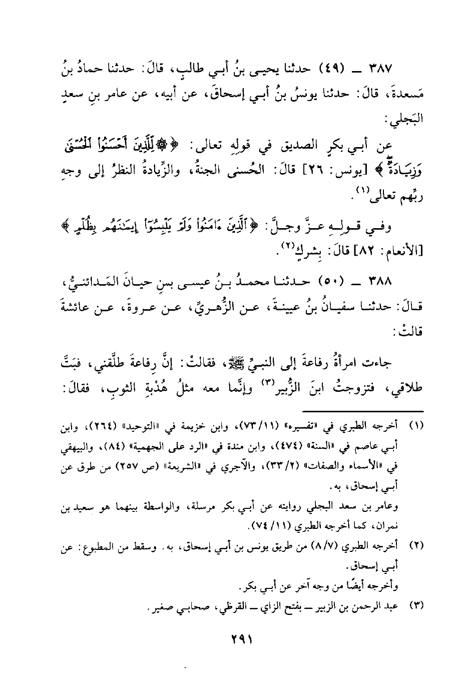 387 - (49) حدثنا يحيى بن أبي طالب، قال: حدثنا حَمَّادُ بْنُ مَسْعَدَةَ، قَالَ: حَدَّثَنَا يُونُسُ بْنُ أَبِي إِسْحَاقَ، عَنْ أَبِيهِ، عَنْ عَامِرِ بْنِ سَعْدٍ الْبَجَلِيِّ: عَنْ أَبِي بَكْرٍ الصِّدِّيقِ فِي قوله تعالى: {للذين أحسنوا الحسنى وزيادة} قَالَ: الْحُسْنَى الْجَنَّةُ، وَالزِّيَادَةُ النَّظَرُ إِلَى وَجْهِ رَبِّهِمْ تَعَالَى. وَفِي قَوْلِهِ عَزَّ وَجَلَّ {الَّذِينَ أمنوا ولم يلبسوا إيمنهم بظلم} قال: بشرك.