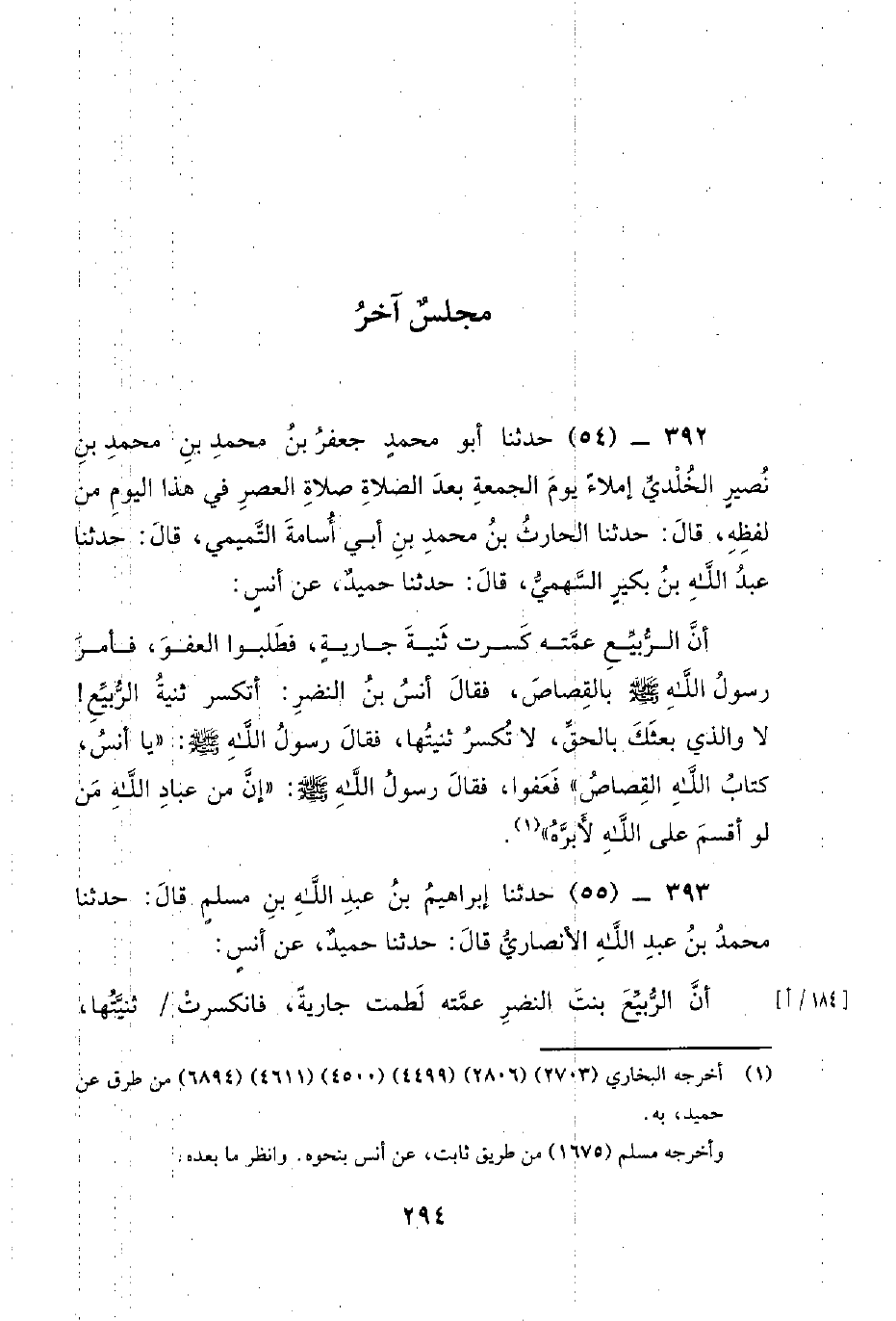 392 - (54) حَدَّثَنَا أَبُو مُحَمَّدٍ جَعْفَرُ بْنُ مُحَمَّدِ بْنِ مُحَمَّدِ بْنِ نُصَيْرٍ الْخَلَدِيُّ إِمْلاءً يَوْمَ الْجُمُعَةِ بَعْدَ الصَّلاةِ صَلاةِ الْعَصْرِ فِي هَذَا الْيَوْمِ مِنْ لَفْظِهِ، قَالَ: حَدَّثَنَا الْحَارِثُ بْنُ مُحَمَّدِ بْنِ أَبِي أُسَامَةَ التَّمِيمِيُّ، قَالَ: حَدَّثَنَا عَبْدُ اللَّهِ بْنُ بُكَيْرٍ السَّهْمِيُّ، قَالَ: حَدَّثَنَا حُمَيْدٌ، عَنْ أَنَسٍ: أَنَّ الرُّبَيِّعَ عَمَّتَهُ كَسَرَتْ ثَنِيَّةَ جَارِيَةٍ، فَطَلَبُوا الْعَفْوَ، فَأَمَر رَسُول اللَّهِ صَلَّى اللَّهُ عَلَيْهِ وَسَلَّمَ بِالْقِصَاصِ، فَقَالَ أَنَسُ بْنُ النَّضْرِ: أَتُكْسَرُ ثَنِيَّةُ الرُّبَيِّعِ! لا وَالَّذِي بَعَثَكَ بِالْحَقِّ، لا تُكْسَرُ ثَنِيَّتُهَا، فَقَالَ رَسُولُ اللَّهِ صَلَّى اللَّهُ عَلَيْهِ وَسَلَّمَ: يَا أَنَسُ، كِتَابُ اللَّهِ الْقِصَاصُ، فَعَفْوًا، فَقَالَ رَسُولُ اللَّهِ صَلَّى اللَّهُ عَلَيْهِ وَسَلَّمَ: إِنَّ مِنْ عِبَادِ اللَّهِ مَنْ لَوْ أَقْسَمَ عَلَى اللَّهِ لأبره.