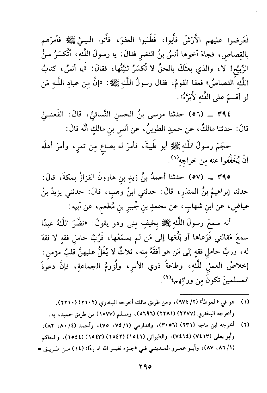 395 - (57) حَدَّثَنَا أَحْمَدُ بْنُ زَيْدِ بْنِ هَارُونَ الْقَزَّازُ بِمَكَّةَ، قَالَ: حَدَّثَنَا إِبْرَاهِيمُ بْنُ الْمُنْذِرِ، قَالَ: حَدَّثَنِي ابْنُ وَهْبٍ، قَالَ: حَدَّثَنِي يَزِيدُ بْنُ عِيَاضٍ، عَنِ ابْنِ شِهَابٍ، عَنْ مُحَمَّدِ بْنِ جُبَيْرِ بْنِ مُطْعِمٍ، عَنْ أَبِيهِ: أَنَّهُ سَمِعَ رَسُول اللَّهِ صَلَّى اللَّهُ عَلَيْهِ وَسَلَّمَ بِخَيْفِ مِنًى وَهُوَ يَقُولُ: نَضَّرَ اللَّهُ عَبْدًا سَمِعَ مَقَالَتِي فَوَعَاهَا أَوْ بَلَّغَهَا إِلَى مَنْ لَمْ يَسْمَعْهَا، فَرُبَّ حَامِلِ فِقْهٍ لا فِقْهَ لَهُ، وَرُبَّ حَامِلِ فِقْهٍ إِلَى مَنْ هُوَ أَفْقَهُ مِنْهُ، ثَلاثٌ لا يَغِلُّ عَلَيْهِنَّ قَلْبُ مُؤْمِنٍ: إِخْلاصُ الْعَمَلِ للَّهِ، وَطَاعَةُ ذَوِي الأَمْرِ، وَلُزُومُ الْجَمَاعَةِ، فَإِنَّ دَعْوَةَ الْمُسْلِمِينَ تَكُونُ مِنْ وَرَائِهِمْ.