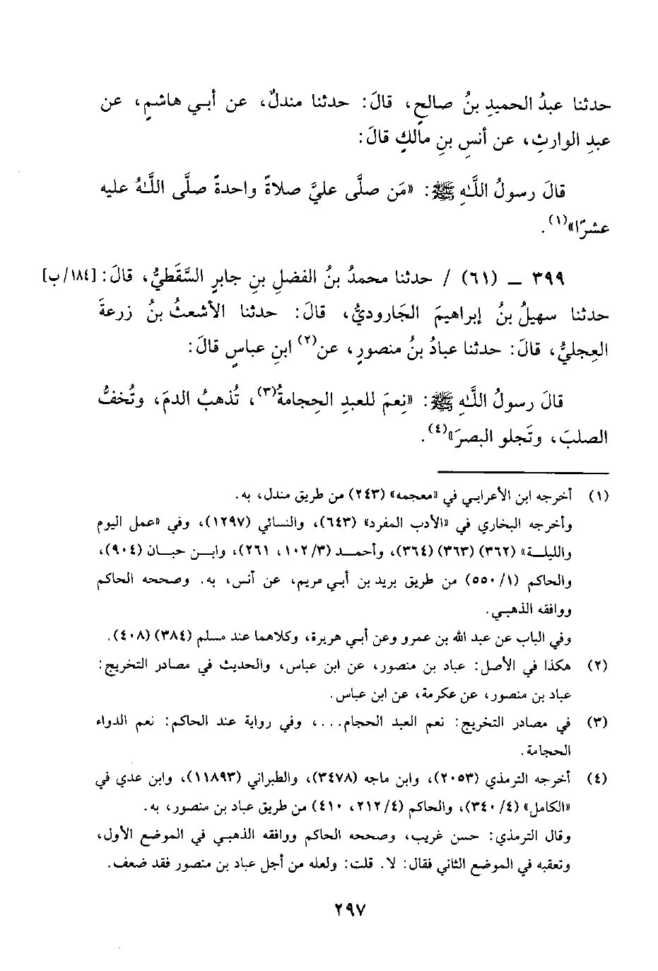 399 - (61) / حَدَّثَنَا مُحَمَّدُ بْنُ الْفَضْلِ بْنِ جَابِرٍ السَّقَطِيُّ، قَالَ: حَدَّثَنَا سُهَيْلُ بْنُ إِبْرَاهِيمَ الْجَارُودِيُّ، قَالَ: حَدَّثَنَا الأَشْعَثُ بْنُ زُرْعَةَ الْعَجْلِيُّ، قَالَ: حَدَّثَنَا عَبَّادُ بْنُ مَنْصُورٍ، عَنْ ابْنِ عَبَّاسٍ قَالَ: قال رسول الله صلى الله عليه وسلم: نِعْمَ لِلْعَبْدِ الْحِجَامَةُ، تُذْهِبُ الدَّمَ، وَتُخِفُّ الصُّلْبَ، وتجلو البصر.