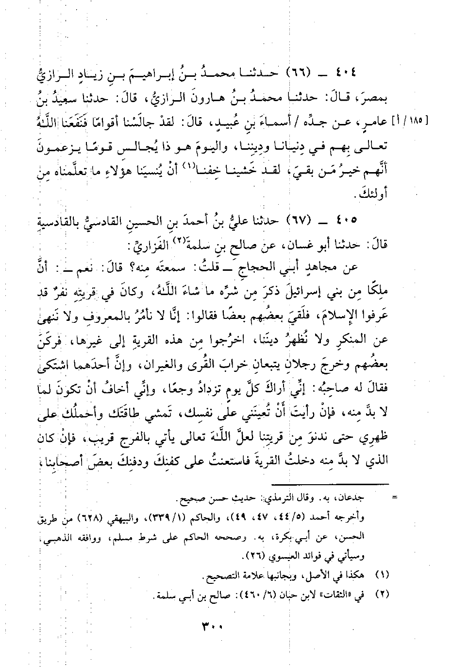 405 - (67) حَدَّثَنَا عَلِيُّ بْنُ أَحْمَدَ بْنِ الْحُسَيْنِ الْقَادِسِيُّ بالقادسية قال: حدثنا أبو غسان، عن صالح بن سلمة الفزاري: عن مجاهد أبي الحجاج - قلت: سمعته منه؟ قال: نعم -: أنّ ملكا من بني إسرائيل ذكر من شره ما شاء الله، وكان في قريته نفر قد عرفوا الإسلام، فلقي بعضهم بعضا فقالوا: إنا لا نأمر بالمعروف ولا ننهى عن المنكر ولا نظهر ديننا، اخرجوا من هذه القرية إلى غيرها، فركن بعضهم وخرج رجلان يتبعان خراب القرى والغيران، وإن أحدهما اشتكى فقال له صاحبه: إني أراك كل يوم تزداد وجعا، وإني أخاف أن تكون لما لا بد منه، فإن رأيت أن تعينني على نفسك، تمشي طاقتك وأحملك على ظهري حتى ندنو من قريتنا لعل الله تعالى يأتي بالفرج قريب، فإن كان الذي لا بد منه دخلت القرية فاستعنت على كفنك ودفنك بعض أصحابنا، -[301]- فذكر أنه أصيب، فغطى وجهه بخليق عليه. قال: فدخل القرية ومات ملكها، فخرجوا به وهم مقيمون عند قبره ثلاثة أيام، فرجع إلى صاحبه، فوجد الطير قد وقع على وجهه فأكلوا عيينه، فلما رأى ذلك جزع وشق عليه، فقال، اللهم أنت الحكم العدل وإليك ينتهي الأمر وأنت علام الغيوب، هذا البائس - فوصفه بالطاعة - لم يذق نعمة الدنيا، مات فسلطت على عينيه الطير فأكلوها، ثم هذا الذي كان يدعو معك إلها يعبد عبادك - فوصفه - أكرمته في الدنيا حتى أصاب - فوصف لذته منها - ثم مات فحمله الرجال على أعناقها وواروه بالتراب وأقاموا عند قبره ثلاثة أيام تكرمة له. فنام فأرى في منامه أن الذي قلت كما قلت، / وربك عز وجل يقول: أنا رب ذلك ورب هذا، إن هذا لم تكن له حسنة عندي فأجازيه بها غير واحدة، فأردت أن أعطيه إياها في الدنيا ولا يكون له عندي إلا العذاب والنكال، وإن صاحبك لم تكن له غير سيئة واحدة فأردت أن أقتصها منه - أو كلمة تشبه هذا - في الدنيا فيلقاني وليس له عندي إلا الجنان الخلد.