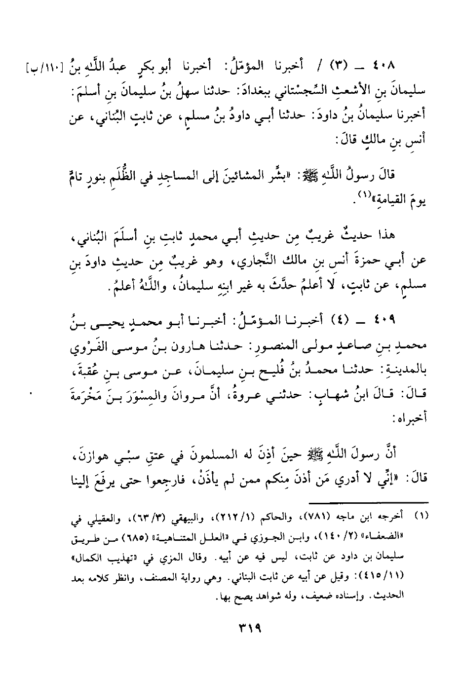 408 - (3) / أخبرنا المؤمل: أخبرنا أَبُو بَكْرٍ عَبْدُ اللَّهِ بْنُ سُلَيْمَانَ بْنِ الأشعث السجستاني ببغداد: حدثنا سهل بن سليمان بن أسلم: أخبرنا سليمان بن داود، حدثنا أَبِي دَاوُدُ بْنُ مُسْلِمٍ، عن ثابت البناني، عن أنس بن مالك قال: قال رسول الله صلى الله عليه وسلم: بشر المشائين إلى المساجد في الظلم بِنُورٍ تَامٍّ يَوْمَ الْقِيَامَةِ.