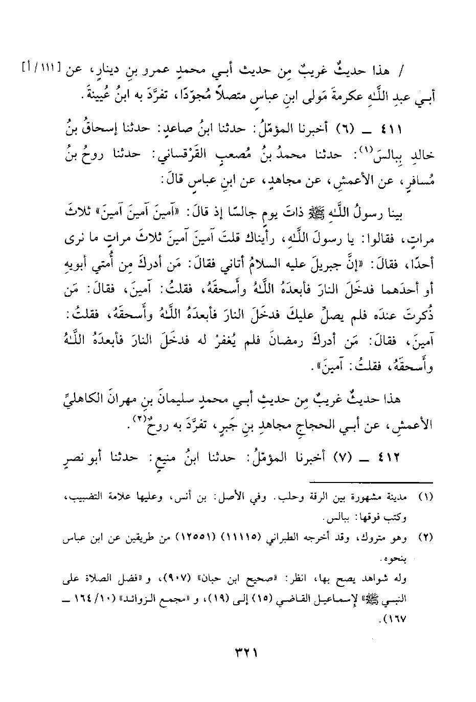 411 - (6) أخبرنا المؤمل: حدثنا ابن صاعد: حدثنا إسحاق بن خالد بن يزيد ببالس: حدثنا محمد بن مصعب القرقساني: حدثنا رَوْحُ بْنُ مُسَافِرٍ، عَنِ الْأَعْمَشِ، عَنْ مُجَاهِدٍ، عن ابن عباس قَالَ: بَيْنَا رَسُول اللَّهِ صَلَّى اللَّهُ عَلَيْهِ وَسَلَّمَ ذَاتَ يوم جالسا إذ قَالَ: آمِينَ آمِينَ آمِينَ ثَلَاثَ مَرَّاتٍ، فَقَالُوا: يا رسول الله، رأيناك قلت آمين آمين ثلاث مرات ما نَرَى أَحَدًا، فَقَالَ: إِنَّ جِبْرِيلَ عَلَيْهِ السَّلَامُ أتاني فقال: من أدرك من أمتي أَبَوَيْهِ أَوْ أَحَدَهُمْا فَدَخَلَ النار فأبعده الله وأسحقه، فقلت: آمين، فقال: مَنْ ذُكِرْتَ عِنْدَهُ فَلَمْ يُصَلِّ عَلَيْكَ فَدَخَلَ النار فأبعده الله وأسحقه، فقلت: آمين، فقال: مَنْ أَدْرَكَ رَمَضَانَ فلم يُغْفَرْ لَهُ فَدَخَلَ النَّارَ فَأَبْعَدَهُ اللَّهُ وَأَسْحَقَهُ، فَقُلْتُ: آمِينَ.