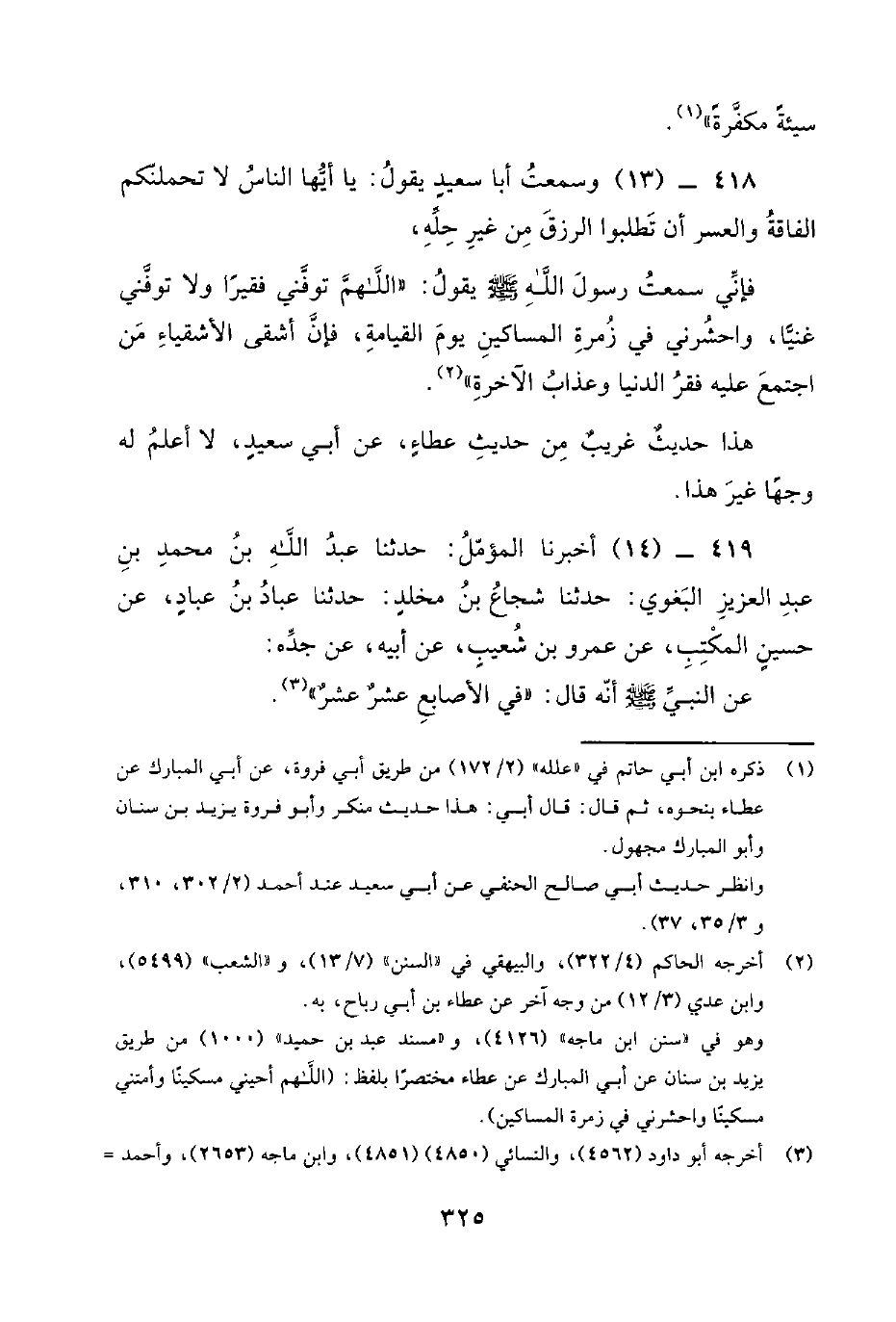 418 - (13) وسمعت أبا سعيد يقول: يا أيها الناس لا تحملنكم الفاقة والعسرة أَنْ تَطْلُبُوا الرِّزْقَ مِنْ غَيْرِ حِلِّهِ، فَإِنِّي سَمِعْتُ رَسُول اللَّهِ صَلَّى اللَّهُ عَلَيْهِ وَسَلَّمَ يَقُولُ: اللَّهُمَّ تَوَفَّنِي فَقِيرًا وَلَا تَوَفَّنِي غَنِيًّا، وَاحْشُرْنِي فِي زُمْرَةِ الْمَسَاكِينِ يَوْمَ الْقِيَامَةِ، فَإِنَّ أَشْقَى الْأَشْقِيَاءَ مَنِ اجْتَمَعَ عَلَيْهِ فَقْرُ الدُّنْيَا وَعَذَابُ الْآخِرَةِ.
