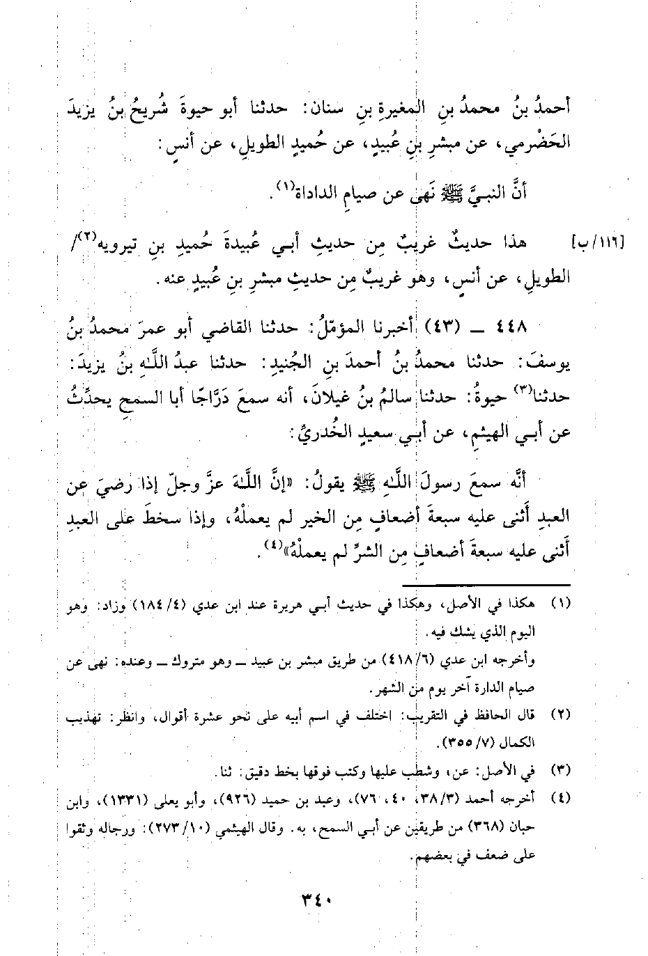 448 - (43) أخبرنا المؤمل: حدثنا القاضي أبو عمر محمد بن يوسف: حدثنا محمد بن أحمد بن الجنيد: حدثنا عبد الله بن يزيد: حدثنا حيوة: حدثنا سَالِمُ بْنُ غَيْلَانَ، أَنَّهُ سَمِعَ دَرَّاجًا أَبَا السَّمْحِ يُحَدِّثُ عَنْ أَبِي الْهَيْثَمِ، عَنْ أَبِي سعيد الخدري: أَنَّهُ سَمِعَ رَسُول اللَّهِ صَلَّى اللَّهُ عَلَيْهِ وَسَلَّمَ يَقُولُ: إِنَّ اللَّهَ عَزَّ وَجَلَّ إِذَا رضي عَنِ الْعَبْدِ أَثْنَى عَلَيْهِ سَبْعَةَ أَضْعَافٍ مِنَ الخير لم يعمله، وإذا سخط عَلَى الْعَبْدِ أَثْنَى عَلَيْهِ سَبْعَةَ أَضْعَافٍ مِنَ الشَّرِّ لَمْ يَعْمَلْهُ.