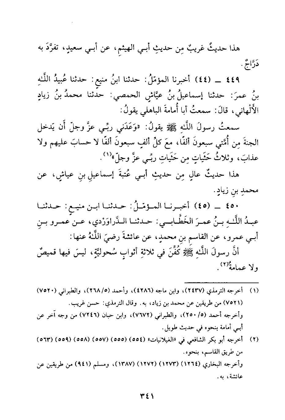 450 - (45) أخبرنا المؤمل: حدثنا ابن منيع: حدثنا عبد الله بن عمر الخطابي: حدثنا الدراوردي، عن عَمْرِو بْنِ أَبِي عَمْرٍو، عَنِ الْقَاسِمِ بْنِ محمد، عَنْ عَائِشَةَ رَضِيَ اللَّهُ عَنْهَا: أَنَّ رَسُول اللَّهِ صَلَّى اللَّهُ عَلَيْهِ وَسَلَّمَ كُفِّنَ فِي ثَلَاثَةِ أَثْوَابٍ سَحُولِيَّةٍ، لَيْسَ فِيهَا قَمِيصٌ وَلَا عِمَامَةٌ.