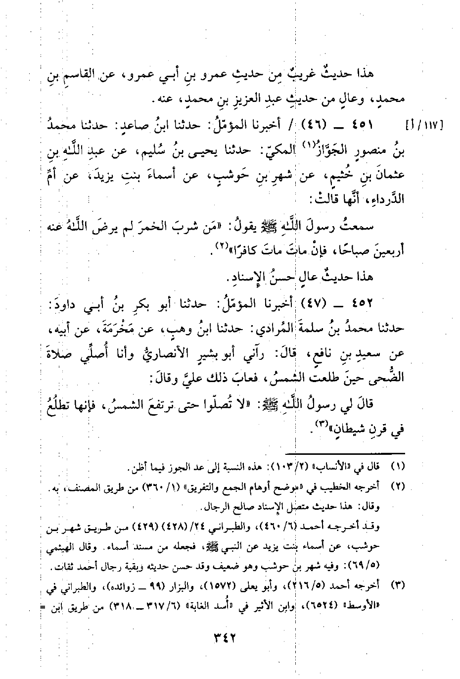 451 - (46) / أخبرنا المؤمل: حدثنا ابن صاعد: حدثنا محمد بن منصور الجواز المكي: حدثنا يَحْيَى بْنُ سُلَيْمٍ، عَنْ عَبْدِ اللَّهِ بْنِ عُثْمَانَ بْنِ خُثَيْمٍ، عَنْ شَهْرِ بْنِ حَوْشَبٍ، عَنْ أَسْمَاءَ بِنْتَ يَزِيدَ، عَنْ أُمِّ الدَّرْدَاءِ، أَنَّهَا قَالَتْ: سَمِعْتُ رَسُول اللَّهِ صَلَّى اللَّهُ عَلَيْهِ وَسَلَّمَ يَقُولُ: مَنْ شَرِبَ الْخَمْرَ لَمْ يَرْضَ اللَّهُ عَنْهُ أَرْبَعِينَ صَبَاحًا، فَإِنْ مَاتَ مات كافرا.