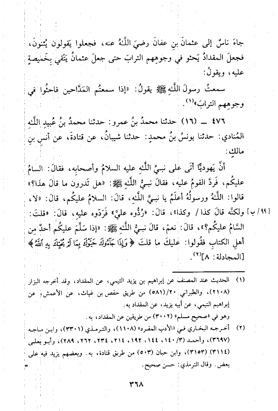476 - (16) حدثنا محمد بن عمرو: حدثنا محمد بن عبيد الله المنادي: حَدَّثَنَا يُونُسُ بْنُ مُحَمَّدٍ: حَدَّثَنَا شَيْبَانُ، عَنْ قَتَادَةَ، عَنْ أَنَسِ بْنِ مَالِكٍ: أَنَّ يهوديا أتى على نبي الله عليه السلام وَأَصْحَابِهِ، فَقَالَ: السَّامُ عَلَيْكُمْ، فَرَدَّ الْقَوْمُ عَلَيْهِ، فَقَالَ نَبِيِّ اللَّهِ صَلَّى اللَّهُ عَلَيْهِ وَسَلَّمَ: هَلْ تَدْرُونَ مَا قَالَ هَذَا؟ قَالُوا: اللَّهُ وَرَسُولُهُ أَعْلَمُ يَا نَبِيَّ اللَّهِ، قَالَ: السَّلامُ عَلَيْكُمْ، قَالَ: لا، وَلَكِنَّهُ قَالَ كَذَا / وَكَذَا، قال: ردوه علي فردوه عليه، قَالَ: قُلْتُ: السَّامُ عَلَيْكُمْ؟، قَالَ: نَعَمْ، قَالَ نَبِيِّ اللَّهِ صَلَّى اللَّهُ عَلَيْهِ وَسَلَّمَ: إِذَا سَلَّمَ عَلَيْكُمْ أَحَدٌ مِنْ أَهْلِ الْكِتَابِ فَقُولُوا: عَلَيْكَ مَا قُلْتَ {وَإِذَا جَاءُوكَ حَيَّوْكَ بِمَا لَمْ يُحَيِّكَ بِهِ الله}.