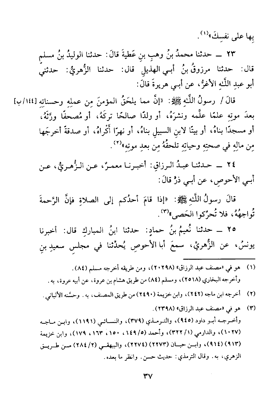 23 - حَدَّثَنَا مُحَمَّدُ بْنُ وَهْبِ بْنِ عَطِيَّةَ قَالَ: حَدَّثَنَا الْوَلِيدُ بْنُ مُسْلِمٍ قَالَ: حَدَّثَنَا مَرْزُوقُ بْنُ أَبِي الْهُذَيْلِ قَالَ: حَدَّثَنَا الزُّهْرِيُّ: حَدَّثَنِي أَبُو عَبْدِ اللَّهِ الأَغَرُّ، عَنْ أَبِي هُرَيْرَةَ قال: قال / رسول الله صلى الله عليه وسلم: أن مِمَّا يَلْحَقُ الْمُؤْمِنَ مِنْ عَمَلِهِ وَحَسَنَاتِهِ بَعْدَ مَوْتِهِ عِلْمًا عَلَّمَهُ وَنَشَرَهُ، أَوْ وَلَدًا صَالِحًا تَرَكَهُ، أَوْ مُصْحَفًا وَرَّثَهُ، أَوْ مَسْجِدًا بَنَاهُ، أَوْ بَيْتًا لابْنِ السَّبِيلِ بَنَاهُ، أَوْ نَهْرًا أَكْرَاهُ، أَوْ صَدَقَةً أَخْرَجَهَا مِنْ مَالِهِ فِي صِحَّتِهِ وَحَيَاتِهِ تَلْحَقُهُ مِنْ بَعْدِ موته.