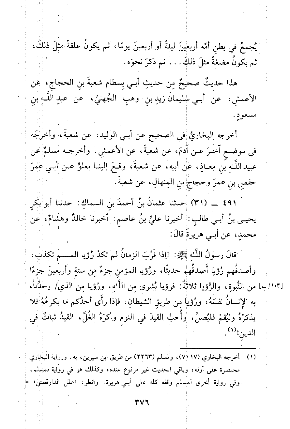 491 - (31) حَدَّثَنَا عُثْمَانُ بْنُ أَحْمَدَ بْنِ السِّمَاكِ: حَدَّثَنَا أَبُو بَكْرٍ يَحْيَى بْنُ أَبِي طَالِبٍ: أَخْبَرَنَا عَلِيُّ بْنُ عَاصِمٍ: أَخْبَرَنَا خَالِدٌ وَهِشَامٌ، عَنْ مُحَمَّدٍ، عَنْ أَبِي هُرَيْرَةَ قَالَ: قَالَ رَسُول اللَّهِ صَلَّى اللَّهُ عَلَيْهِ وَسَلَّمَ: إِذَا قَرُبَ الزَّمَانُ لَمْ تَكَدْ رُؤْيَا الْمُسْلِمِ تَكْذِبُ، وَأَصْدَقُهُمْ رُؤْيَا أَصْدَقُهُمْ حَدِيثًا، وَرُؤْيَا الْمُؤْمِنِ جُزْءٌ مِنْ سِتَّةٍ وَأَرْبَعِينَ جُزْءًا مِنَ النُّبُوَّةِ، وَالرُّؤْيَا ثَلاثَةُ: فَرُؤْيَا بُشْرَى مِنَ اللَّهِ، وَرُؤْيَا مِنَ الَّذِي / يحدث به الإنسان نفسه، ورؤيا مِنْ طَرِيقِ الشَّيْطَانِ، فَإِذَا رَأَى أَحَدُكُمْ مَا يَكْرَهُهُ فَلا يَذْكُرْهُ وَلْيَقُمْ فَلْيُصِلِّ، وَأُحِبُّ الْقَيْدَ فِي النَّوْمِ وَأَكْرَهُ الْغُلَّ، الْقَيْدُ ثَبَاتٌ فِي الدين.
