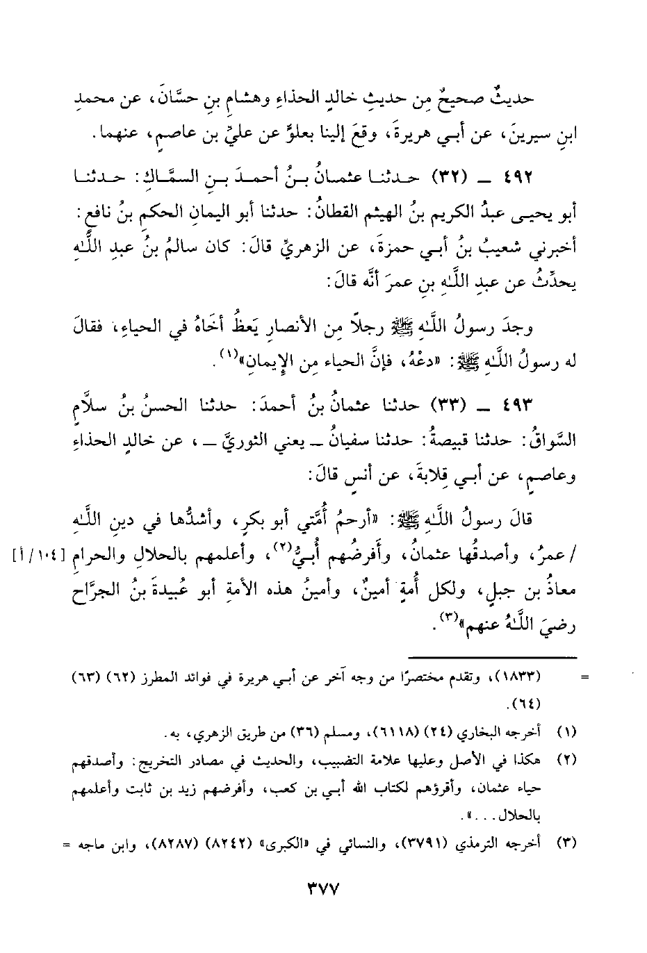 492 - (32) حَدَّثَنَا عُثْمَانُ بْنُ أَحْمَدَ بْنِ السِّمَاكِ: حَدَّثَنَا أَبُو يَحْيَى عَبْدُ الْكَرِيمِ بْنُ الْهَيْثَمِ الْقَطَّانُ: حَدَّثَنَا أَبُو الْيَمَانِ الْحَكَمُ بْنُ نَافِعٍ: أَخْبَرَنِي شُعَيْبُ بْنُ أَبِي حَمْزَةَ، عَنْ الزُّهْرِيِّ قَالَ: كَانَ سَالِمُ بْنُ عَبْدِ اللَّهِ يُحَدِّثُ عَنْ عَبْدِ اللَّهِ بْنِ عُمَرَ أَنَّهُ قَالَ: وَجَدَ رَسُول اللَّهِ صَلَّى اللَّهُ عَلَيْهِ وَسَلَّمَ رَجُلا مِنَ الأَنْصَارِ يَعِظُ أَخَاهُ فِي الْحَيَاءِ، فَقَالَ له رسول الله صلى الله عليه وسلم: دَعْهُ، فَإِنَّ الْحَيَاءَ مِنَ الإِيمَانِ.
