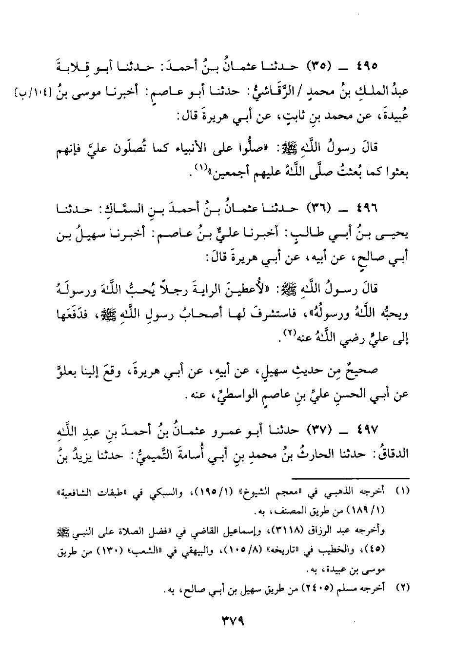495 - (35) حَدَّثَنَا عُثْمَانُ بْنُ أَحْمَدَ: حَدَّثَنَا أَبُو قِلابَةَ عَبْدُ الْمَلِكِ بْنُ مُحَمَّدٍ / الرَّقَاشِيُّ: حَدَّثَنَا أَبُو عَاصِمٍ: أَخْبَرَنَا مُوسَى بْنُ عُبَيْدَةَ، عَنْ مُحَمَّدِ بْنِ ثَابِتٍ، عَنْ أَبِي هُرَيْرَةَ قَالَ: قَالَ رَسُول اللَّهِ صَلَّى اللَّهُ عَلَيْهِ وَسَلَّمَ: صَلُّوا عَلَى الأَنْبِيَاءِ كَمَا تُصَلُّونَ عَلَيَّ فَإِنَّهُمْ بُعِثُوا كَمَا بُعِثْتُ صَلَّى اللَّهُ عَلَيْهِمْ أَجْمَعِينَ.