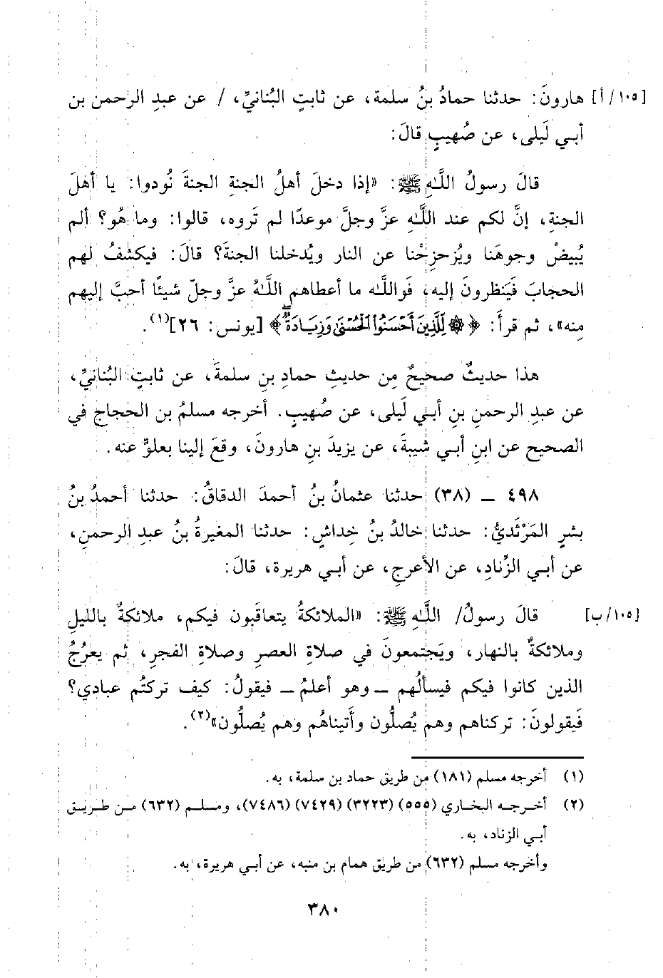 498 - (38) حَدَّثَنَا عُثْمَانُ بْنُ أَحْمَدَ الدَّقَّاقُ: حَدَّثَنَا أَحْمَدُ بْنُ بِشْرٍ الْمَرْثَدِيُّ: حَدَّثَنَا خَالِدُ بْنُ خِدَاشٍ: حَدَّثَنَا الْمُغِيرَةُ بْنُ عَبْدِ الرَّحْمَنِ، عَنْ أَبِي الزِّنَادِ، عَنِ الْأَعْرَجِ، عَنْ أَبِي هُرَيْرَةَ، قَالَ: قال رسول / الله صلى الله عليه وسلم: الْمَلائِكَةُ يَتَعَاقَبُونَ فِيكُمْ، مَلائِكَةٌ بِاللَّيْلِ وَمَلائِكَةٌ بِالنَّهَارِ، وَيَجْتَمِعُونَ فِي صَلاةِ الْعَصْرِ وَصَلاةِ الْفَجْرِ، ثُمَّ يَعْرُجُ الَّذِينَ كَانُوا فِيكُمْ فَيَسْأَلُهُمْ - وَهُوَ أَعْلَمُ - فَيَقُولُ: كَيْفَ تَرَكْتُمْ عِبَادِي؟ فَيَقُولُونَ: تَرَكْنَاهُمْ وَهُمْ يُصَلُّونَ وَأَتَيْنَاهُمْ وَهُمْ يُصَلُّونَ.