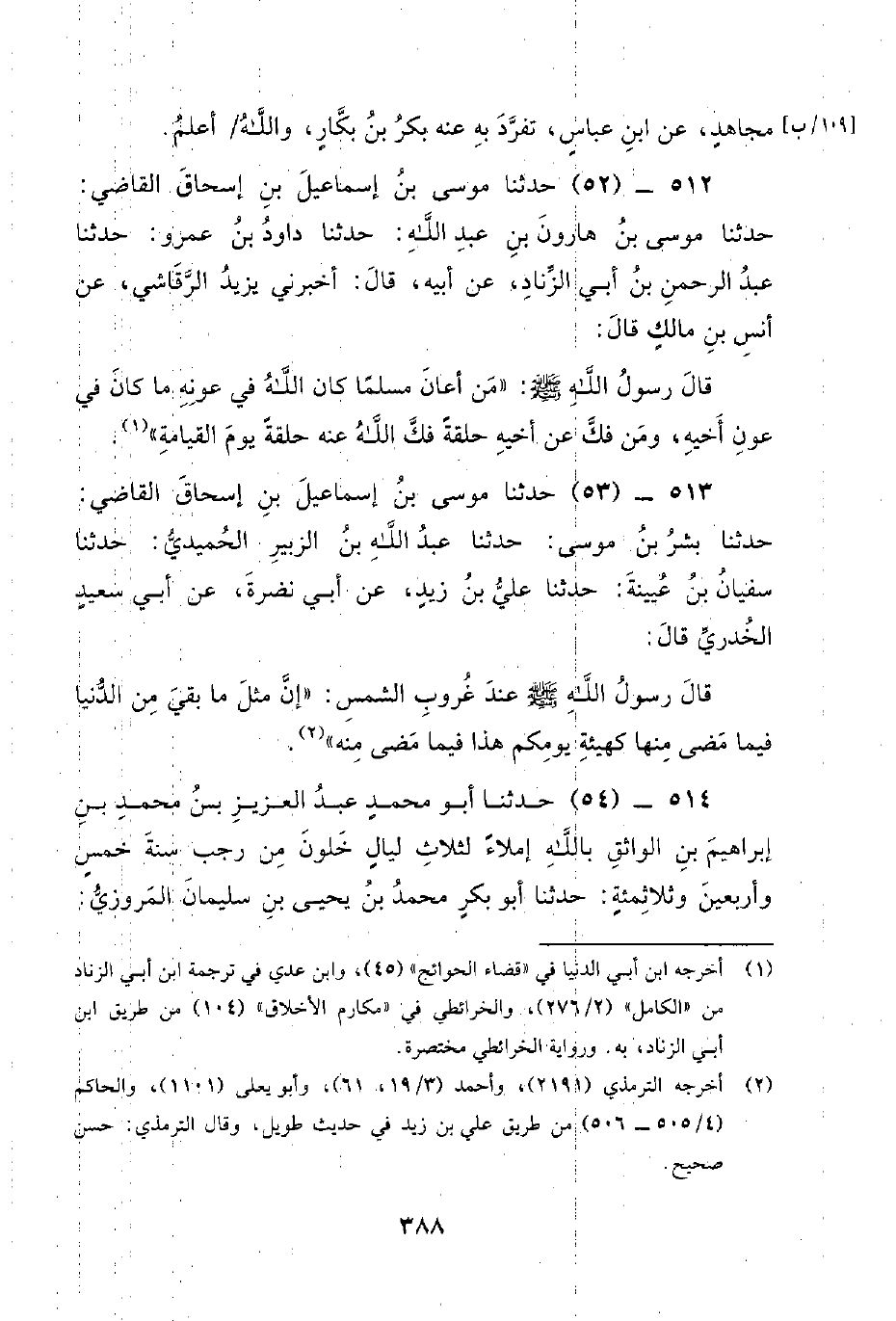 512 - (52) حَدَّثَنَا مُوسَى بْنُ إِسْمَاعِيلَ بْنِ إِسْحَاقَ الْقَاضِي: حَدَّثَنَا مُوسَى بْنُ هَارُونَ بْنُ عَبْدِ اللَّهِ: حَدَّثَنَا دَاوُدُ بْنُ عَمْرٍو: حَدَّثَنَا عَبْدُ الرَّحْمَنِ بْنُ أَبِي الزِّنَادِ، عَنْ أَبِيهِ، قَالَ أَخْبَرَنِي يَزِيدَ الرَّقَاشِيِّ، عَنْ أَنَسِ بْنِ مَالِكٍ قَالَ: قال رسول الله صلى الله عليه وسلم: مَنْ أَعَانَ مُسْلِمًا كَانَ اللَّهُ فِي عَوْنِهِ مَا كَانَ فِي عَوْنِ أَخِيهِ، وَمَنْ فَكَّ عَنْ أَخِيهِ حَلْقَةً فَكَّ اللَّهُ عَنْهُ حَلْقَةً يوم القيامة.