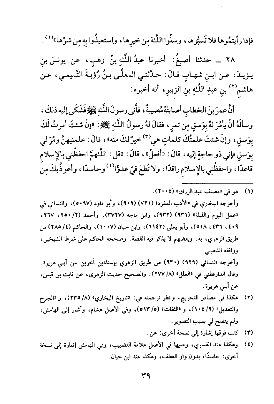 28 - حَدَّثَنَا أَصْبَغُ: أَخْبَرَنَا عَبْدُ اللَّهِ بْنُ وَهْبٍ، عَنْ يُونُسُ بْنُ يَزِيدَ، عَنِ ابْنِ شِهَابٍ قال: حدثني المعلى بن رؤبة التَّمِيمِيُّ، عَنْ هَاشِمِ بْنِ عَبْدِ اللَّهِ بْنِ الزُّبَيْرِ، أَنَّهُ أَخْبَرَهُ: أَنَّ عُمَرَ بْنَ الْخَطَّابِ أَصَابَتْهُ مُصِيبَةٌ، فَأَتَى رَسُول اللَّهِ صَلَّى اللَّهُ عَلَيْهِ وَسَلَّمَ فَشَكَى إِلَيْهِ ذَلِكَ، وَسَأَلَهُ أَنْ يَأْمُرَ لَهُ بِوَسَقٍ مِنْ تَمْرٍ، فَقَالَ لَهُ رسول الله صلى الله عليه وسلم: إن شِئْتَ أَمَرْتُ لَكَ بِوَسَقٍ، وَإِنْ شِئْتَ عَلَّمْتُكَ كَلِمَاتٍ هِيَ خَيْرٌ لَكَ مِنْهُ، قَالَ: عَلِّمْنِيهِنَّ وَمُرْ لِي بِوَسَقٍ فَإِنِّي ذُو حَاجَةٍ إِلَيْهِ، قَالَ: أَفْعَلُ، قَالَ: قُلْ: اللَّهُمَّ احْفَظْنِي بِالإِسْلامِ قَاعِدًا، وَاحْفَظْنِي بِالإِسْلامِ رَاقِدًا، وَلا تطع في عَدُوًّا وَحَاسِدًا، وَأَعُوذُ بِكَ مِنْ -[40]- شَرِّ مَا أَنْتَ آخِذٌ بِنَاصِيَتِهِ، وَأَسْأَلُكَ مِنَ الْخَيْرِ الَّذِي هُوَ بِيَدِكِ كُلِّهِ.
