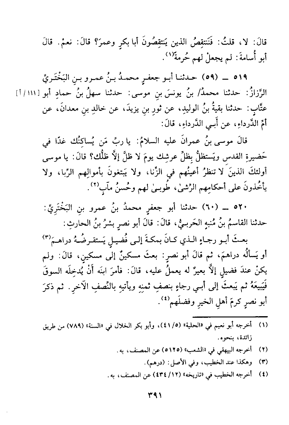 519 - (59) حَدَّثَنَا أَبُو جَعْفَرٍ مُحَمَّدُ بْنُ عَمْرِو بْنِ الْبَخْتَرِيِّ الرَّزَّازُ: حَدَّثَنَا مُحَمَّدُ / بْنُ يُونُسَ بْنِ مُوسَى: حَدَّثَنَا سَهْلُ بْنُ حَمَّادٍ أَبُو عَتَّابٍ: حَدَّثَنَا بَقْيَةُ بْنُ الْوَلِيدِ، عَنِ ثَوْرِ بْنِ يَزِيدَ، عَنْ خَالِدِ بن معدان، عن أم الدراداء، عَنْ أَبِي الدَّرْدَاءِ، قَالَ: قَالَ مُوسَى بْنُ عِمْرَانَ عَلَيْهِ السَّلامُ: يَا رَبِّ مَنْ يُسَاكِنُكَ غَدًا فِي حُضَيْرَةِ الْقُدْسِ وَيَسْتَظِلُّ بِظِلِّ عَرْشِكَ يَوْمَ لا ظِلَّ إِلا ظِلُّكَ؟ قَالَ: يَا مُوسَى أُولَئِكَ الَّذِينَ لا تَنْظُرُ أَعْيُنُهُمْ فِي الزِّنَا، وَلا يَبْتَغُونَ بِأَمْوَالِهِمُ الرِّبَا، وَلا يَأْخُذُونَ عَلَى أَحْكَامِهِمُ الرِّشَى، طُوبَى لَهُمْ وَحُسْنُ مآب.