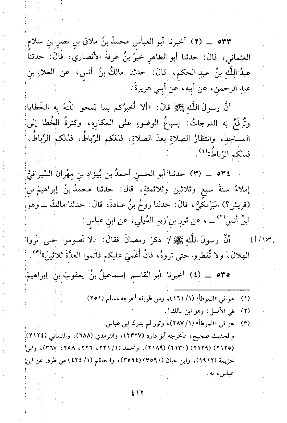 534 - (3) حَدَّثَنَا أَبُو الْحَسَنِ أَحْمَدُ بْنُ بَهْزَادَ بْنِ مهران السيرافي إملاء سنة سبع وثلاثين وثلاثمئة، قَالَ: حَدَّثَنَا مُحَمَّدُ بْنُ إِبْرَاهِيمَ بْنِ (قُرَيْشٍ؟) الْبَرْمَكِيُّ، قَالَ: حَدَّثَنَا رَوْحُ بْنُ عُبَادَةَ، قَالَ: حَدَّثَنَا مَالِكٌ - وَهُوَ ابْنُ أَنَسٍ -، عَنْ ثَوْرِ بْنِ زَيْدٍ الدَّيْلِيِّ، عَنِ ابْنِ عَبَّاسٍ: أَنَّ رَسُول اللَّهِ صَلَّى اللَّهُ عَلَيْهِ وَسَلَّمَ / ذَكَرَ رَمَضَانَ فَقَالَ: لا تَصُومُوا حَتَّى تَرَوُا الْهِلالَ، وَلا تُفْطِرُوا حَتَّى تَرَوْهُ، فَإِنْ أُغْمِيَ عَلَيْكُم فأتموا العدة ثلاثين.