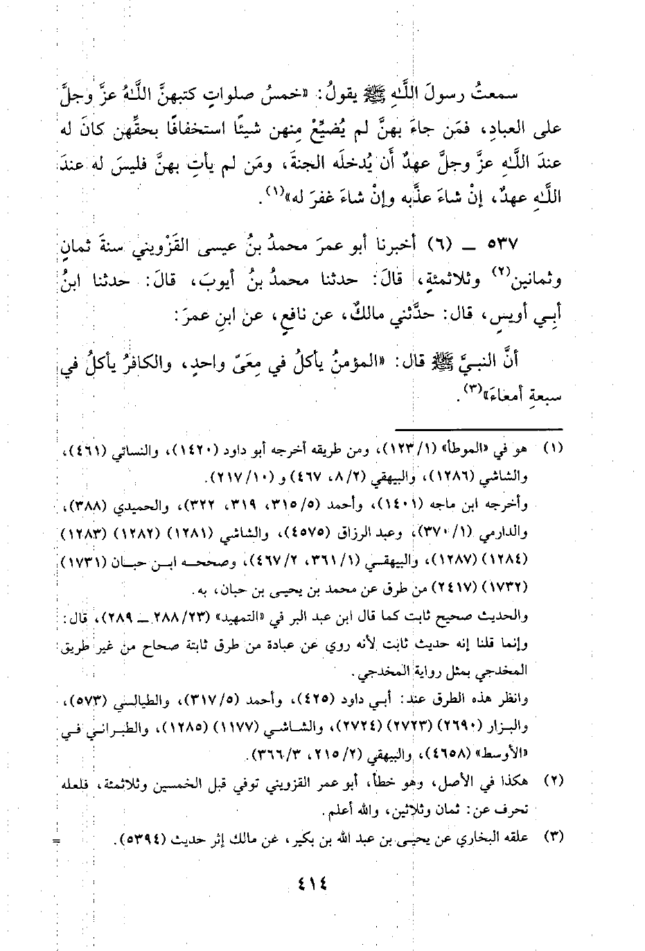537 - (6) أَخْبَرَنَا أَبُو عُمَرَ مُحَمَّدُ بْنُ عِيسَى الْقَزْوِينِيُّ سَنَةَ ثَمَانٍ وَثَمَانِينَ وثلاثمئة، قَالَ: حَدَّثَنَا مُحَمَّدُ بْنُ أَيُّوبَ، قَالَ: حَدَّثَنَا ابْنُ أَبِي أُوَيْسٍ، قَالَ: حَدَّثَنِي مَالِكٌ، عَنْ نَافِعٍ، عَنِ ابْنِ عُمَرَ: أَنَّ النَّبِيَّ صَلَّى اللَّهُ عَلَيْهِ وَسَلَّمَ قَالَ: الْمُؤْمِنُ يَأْكُلُ فِي مِعًى وَاحِدٍ، وَالْكَافِرُ يَأْكُلُ فِي سَبْعَةِ أَمْعَاءٍ.