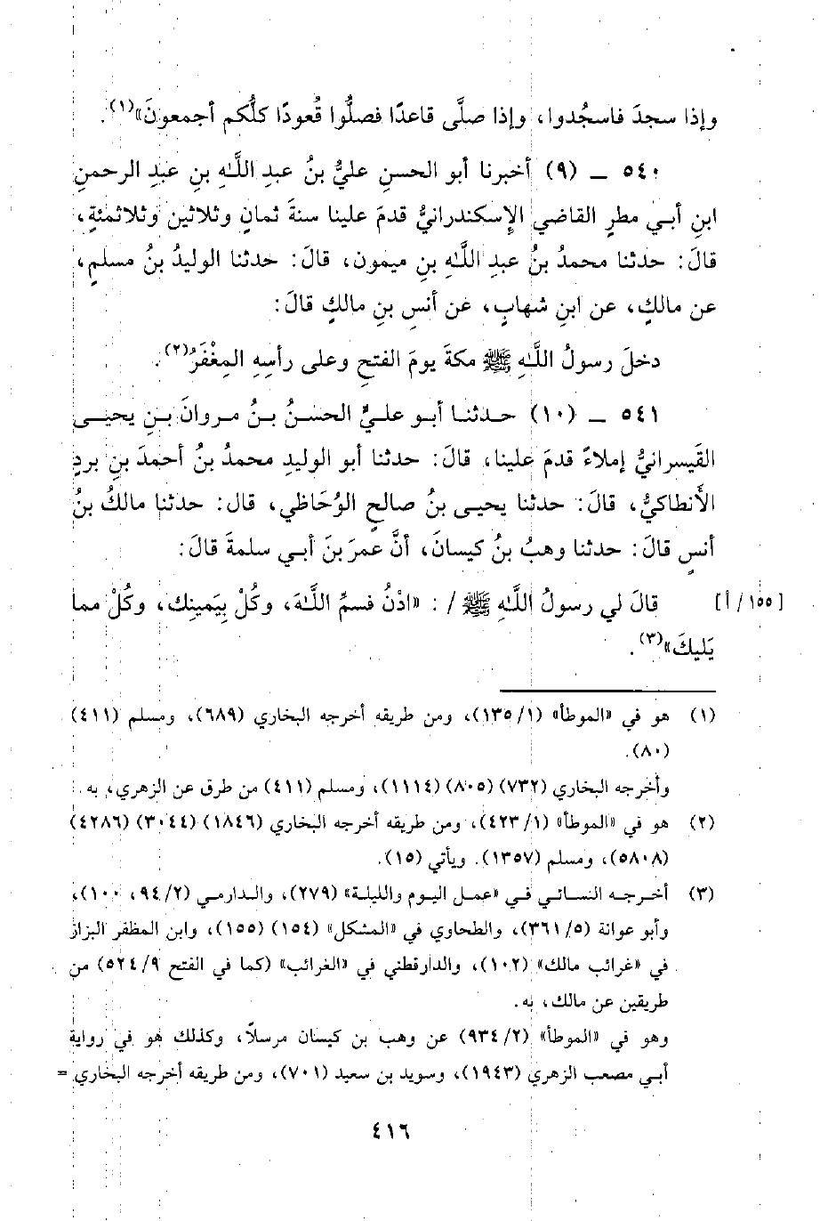 540 - (9) أَخْبَرَنَا أَبُو الْحَسَنِ عَلِيُّ بن عبد الله بن عبد الرحمن ابن أَبِي مَطَرٍ الْقَاضِي الإِسْكَنْدَرَانِيُّ قَدِمَ عَلَيْنَا سَنَةَ ثمان وثلاثين وثلاثمئة، قَالَ: حَدَّثَنَا مُحَمَّد بْن عَبْد اللَّه بْن مَيْمُونٍ، قَالَ: حَدَّثَنَا الْوَلِيدُ بْنُ مُسْلِمٍ، عَنْ مَالِكٍ، عَنْ ابْنِ شِهَابٍ، عَنْ أَنَسِ بْنِ مَالِكٍ قَالَ: دَخَلَ رَسُول اللَّهِ صَلَّى اللَّهُ عَلَيْهِ وَسَلَّمَ مَكَّةَ يَوْمَ الْفَتْحِ وَعَلَى رَأْسِهِ المغفر.