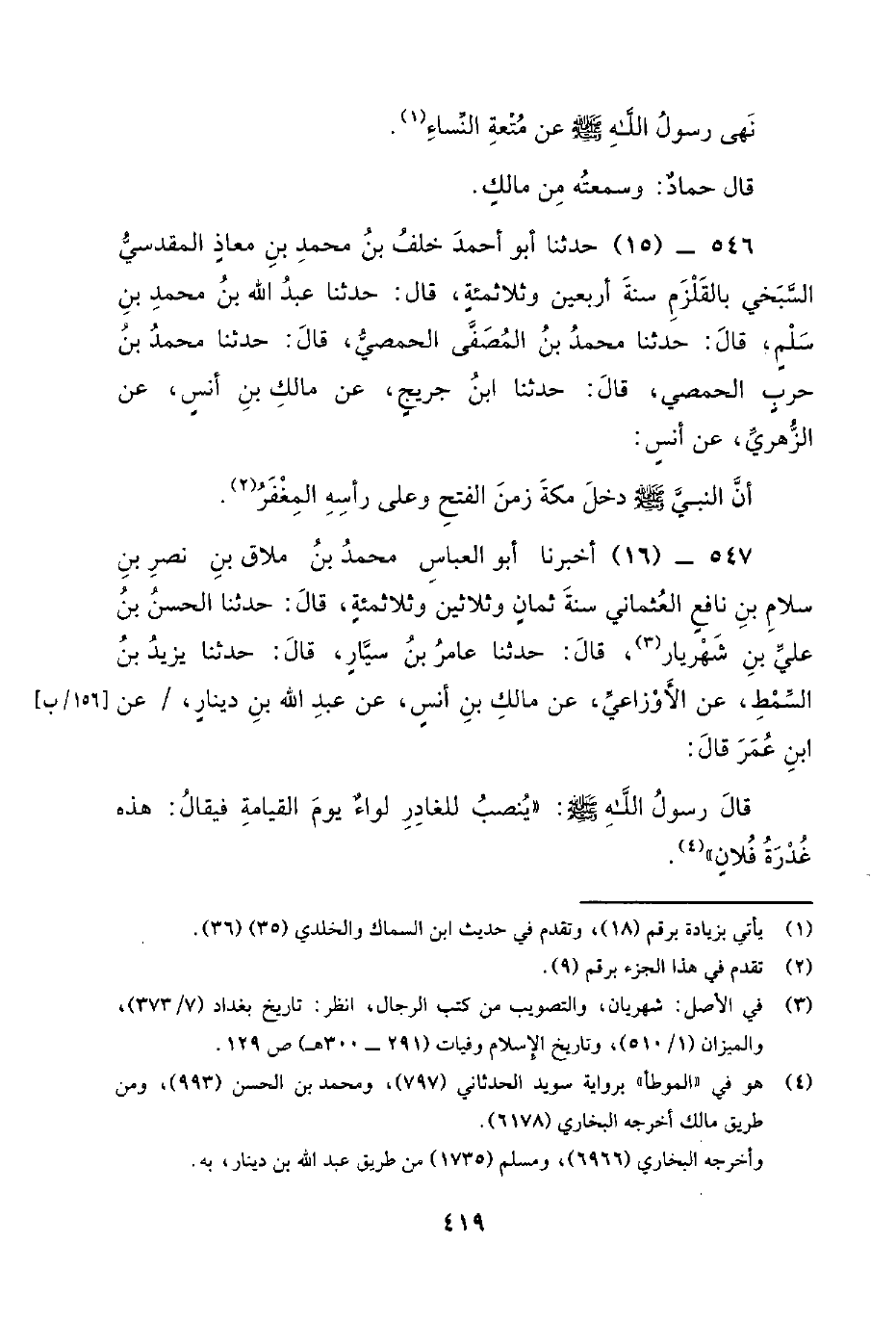 546 - (15) حَدَّثَنَا أَبُو أَحْمَدَ خَلَفُ بْنُ مُحَمَّدِ بْنِ مُعَاذٍ الْمَقْدِسِيُّ السَّبَخِيُّ بِالْقُلْزُمِ سَنَةَ أَرْبَعِينَ وثلاثمئة، قَالَ: حَدَّثَنَا عَبْدُ اللَّهِ بْنُ مُحَمَّدِ بْنِ سَلْمٍ، قَالَ: حَدَّثَنَا مُحَمَّدُ بْنُ الْمُصَفَّى الْحِمْصِيُّ، قَالَ: حَدَّثَنا مُحَمَّدُ بْنُ حَرْبٍ الْحِمْصِيُّ، قَالَ: حَدَّثَنَا ابْنُ جُرَيْجٍ، عَنْ مَالِكِ بْنِ أَنَسٍ، عَنِ الزُّهْرِيِّ، عَنْ أَنَسٍ: أَنَّ النَّبِيَّ صَلَّى اللَّهُ عَلَيْهِ وَسَلَّمَ دَخَلَ مَكَّةَ زَمَنَ الْفَتْحِ وَعَلَى رَأْسِهِ الْمِغْفَرُ.