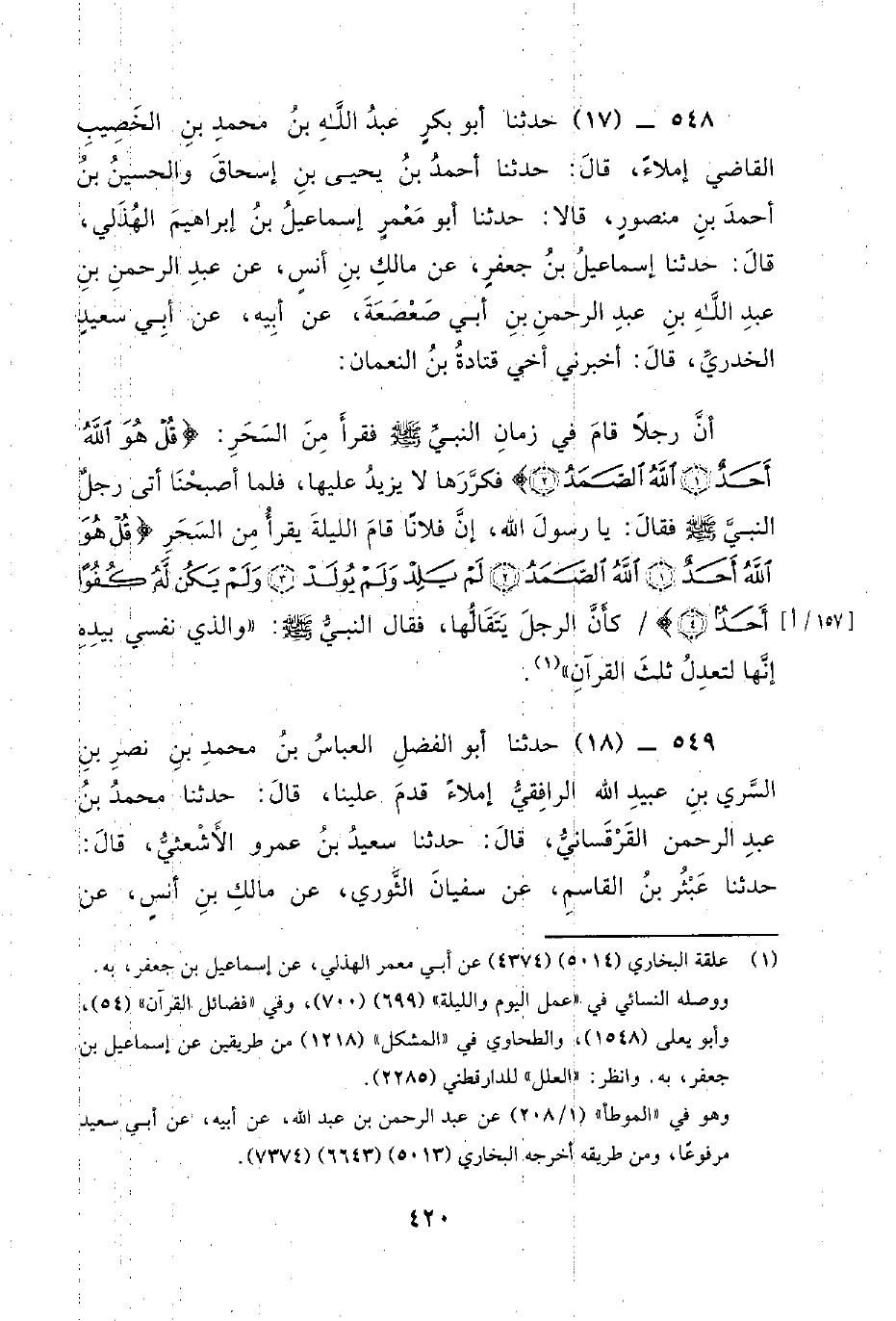 548 - (17) حَدَّثَنَا أَبُو بَكْرٍ عَبْدُ اللَّهِ بْنِ مُحَمَّدِ بْنِ الْخَصِيبِ الْقَاضِي إِمْلاءٍ، قَالَ: حَدَّثَنَا أَحْمَدُ بْنُ يَحْيَى بْنِ إِسْحَاقَ وَالْحُسَيْنُ بْنُ أَحْمَدَ بْنِ مَنْصُورٍ، قَالا: حَدَّثَنَا أَبُو مَعْمَرٍ إِسْمَاعِيلُ بْنُ إِبْرَاهِيمَ الْهُذَلِيُّ، قَالَ: حَدَّثَنَا إِسْمَاعِيلَ بْنُ جَعْفَرٍ، عَنْ مَالِكِ بْنِ أَنَسٍ، عَنْ عَبْدِ الرَّحْمَنِ بْنِ عَبْدِ اللَّهِ بْنِ عَبْدِ الرَّحْمَنِ بْنِ أَبِي صَعْصَعَةَ، عَنْ أَبِيهِ، عَنْ أَبِي سَعِيدٍ الْخُدْرِيِّ، قَالَ: أَخْبَرَنِي أَخِي قَتَادَةُ بْنُ النُّعْمَانِ: أَنَّ رَجُلا قَامَ فِي زَمَانِ النَّبِيّ صَلَّى اللَّهُ عَلَيْهِ وَسَلَّمَ فَقَرَأَ مِنَ السَّحَرِ: {قُلْ هو الله أحد، الله الصمد} فَكَرَّرَهَا لا يَزِيدُ عَلَيْهَا، فَلَمَّا أَصْبَحْنَا أَتَى رَجُلٌ النَّبِيِّ صَلَّى اللَّهُ عَلَيْهِ وَسَلَّمَ فَقَالَ: يَا رَسُولُ اللَّهِ، إِنَّ فُلانًا قَامَ اللَّيْلَةَ يَقْرَأُ من السحر {قل هو الله أحد، الله الصَّمَدُ، لَمْ يَلِدْ وَلَمْ يُولَدْ، وَلَمْ يَكُنْ له كفوا أحد،} / كَأَنَّ الرَّجُلَ يَتَقَالَّهَا، فَقَالَ النَّبِيّ صَلَّى اللَّهُ عَلَيْهِ وَسَلَّمَ: وَالَّذِي نَفْسِي بِيَدِهِ إِنَّهَا لَتَعْدِلُ ثُلُثَ الْقُرْآنِ.