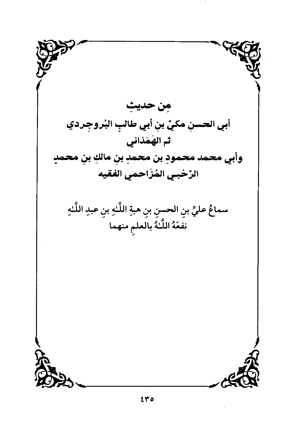 من حديث أبي الحسن مكي بن أبي طالب البروجردي ثم الهمذاني وأبي مُحَمَّدٍ مَحْمُودِ بن محمد بن مالك بن محمد الرحبي المزاحمي الفقيه