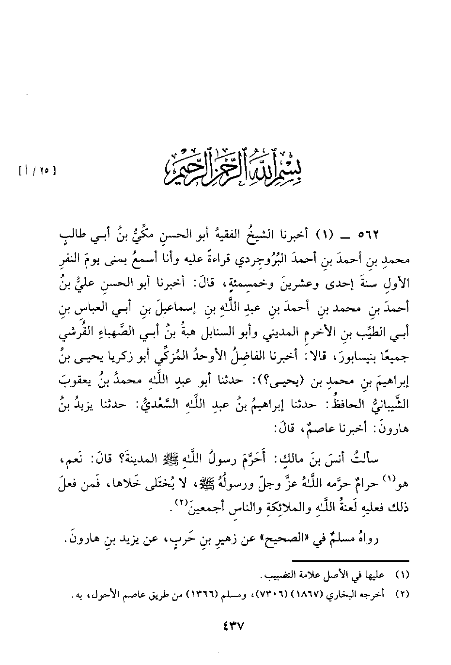562 - (1) أَخْبَرَنَا الشَّيْخُ الْفَقِيهُ أَبُو الْحَسَنِ مَكِيُّ بْنُ أَبِي طَالِبٍ مُحَمَّدُ بْن أَحْمَدَ بْنِ أَحْمَدَ الْبُرُوجِرْدِيُّ قِرَاءَةً عَلَيْهِ وأنا أسمع بمنى يوم النفر الأول سنة إحدى وعشرين وخمسمئة، قَالَ: أَخْبَرَنَا أَبُو الْحَسَنِ عَلِيُّ بْنُ أَحْمَدَ بْنِ مُحَمَّدِ بْنِ أَحْمَدَ بْنِ عَبْدِ اللَّهِ بْن إِسْمَاعِيلَ بْنِ أَبِي الْعَبَّاسِ بْنِ أَبِي الطَّيِّبِ بْنِ الأَخْرَمِ الْمَدِينِيُّ وَأَبُو السَّنَابِلِ هِبَةُ بْنُ أَبِي الصَّهْبَاءِ الْقُرَشِيُّ جَمِيعًا بِنَيْسَابُورَ، قَالا: أَخْبَرَنَا الْفَاضِلُ الأَوْحَدُ الْمُزَكِّي أَبُو زَكَرِيَّا يَحْيَى بْنُ إِبْرَاهِيمَ بْنِ مُحَمَّدِ بْنِ يَحْيَى؟: حَدَّثَنَا أَبُو عَبْدِ اللَّهِ مُحَمَّدُ بْنُ يَعْقُوبَ الشَّيْبَانِيُّ الْحَافِظُ: حَدَّثَنَا إِبْرَاهِيمُ بْنُ عَبْدِ اللَّهِ السَّعْدِيُّ: حَدَّثَنَا يَزِيدُ بْنُ هَارُونَ: أَخْبَرَنَا عَاصِمٌ، قَالَ: سَأَلْتُ أَنَسَ بْنَ مَالِكٍ: أَحَرَّمَ رَسُول اللَّهِ صَلَّى اللَّهُ عَلَيْهِ وَسَلَّمَ الْمَدِينَةَ؟ قَالَ: نَعَمْ، هُوَ حَرَامٌ حَرَّمَهُ اللَّهُ عَزَّ وَجَلَّ وَرَسُولُهُ صَلَّى اللَّهُ عَلَيْهِ وَسَلَّمَ، لا يُخْتَلَى خَلاَهَا، فَمَنْ فَعَلَ ذَلِكَ فَعَلَيْهِ لَعْنَةُ اللَّهِ وَالْمَلَائِكَةِ وَالنَّاسِ أَجْمَعِينَ.