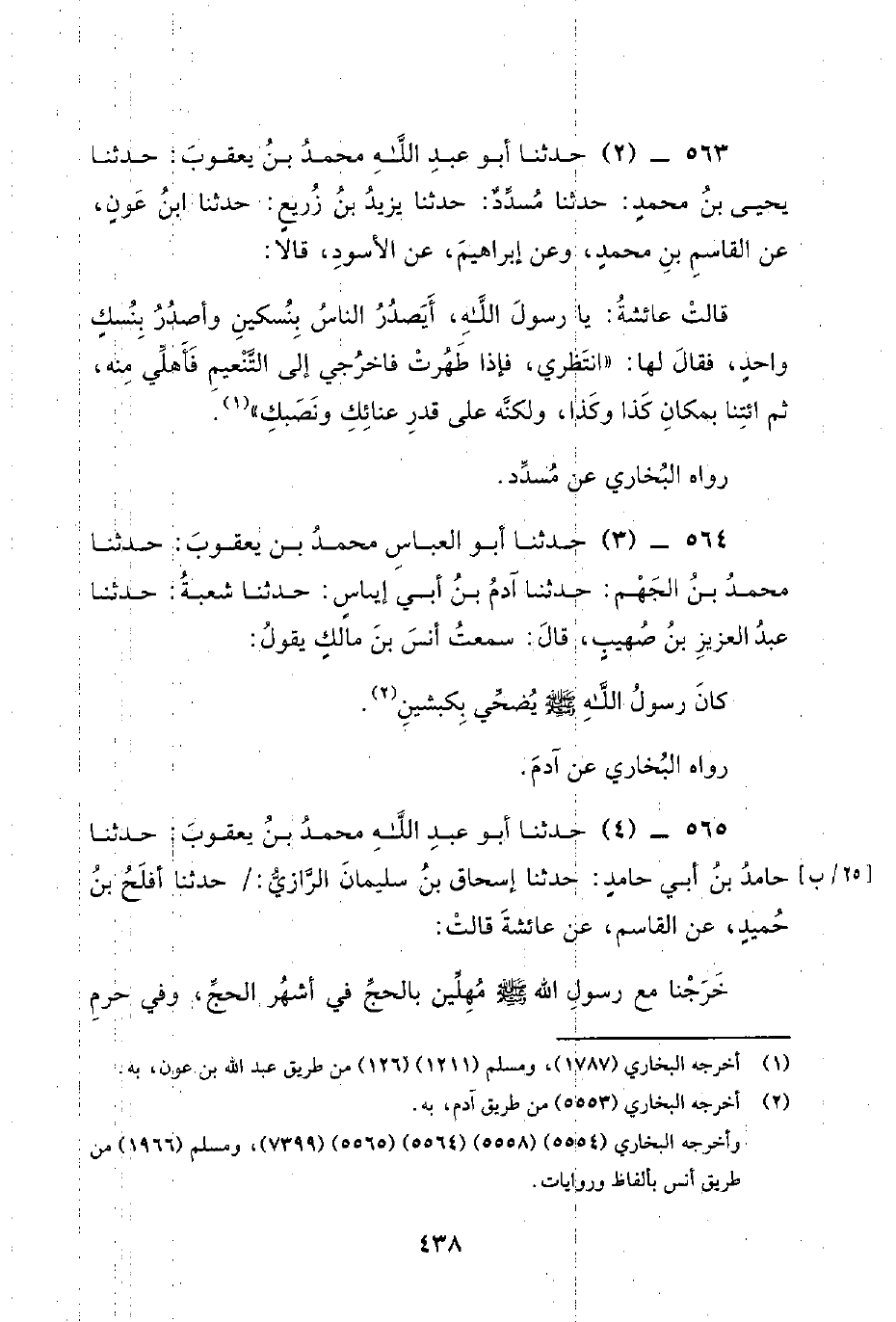565 - (4) حَدَّثَنَا أَبُو عَبْدِ اللَّهِ مُحَمَّدُ بْنُ يَعْقُوبَ: حَدَّثَنَا حَامِدُ بْنُ أَبِي حَامِدٍ: حَدَّثَنَا إِسْحَاقُ بْنُ سُلَيْمَانَ الرَّازِيُّ: / حَدَّثَنَا أَفْلَحُ بْنُ حُمَيْدٍ، عَنِ الْقَاسِمِ، عَنْ عَائِشَةَ قَالَتْ: خَرَجْنَا مَعَ رَسُول اللَّهِ صَلَّى اللَّهُ عَلَيْهِ وَسَلَّمَ مُهِلِّينَ بِالْحَجِّ فِي أَشْهُرِ الْحَجِّ، وَفِي حَرَمِ -[439]- الْحَجِّ، وَفِي لَيَالِيَ الْحَجِّ، حَتَّى نَزَلْنَا بِسَرِفَ، قَالَ: وذكر الحديث.